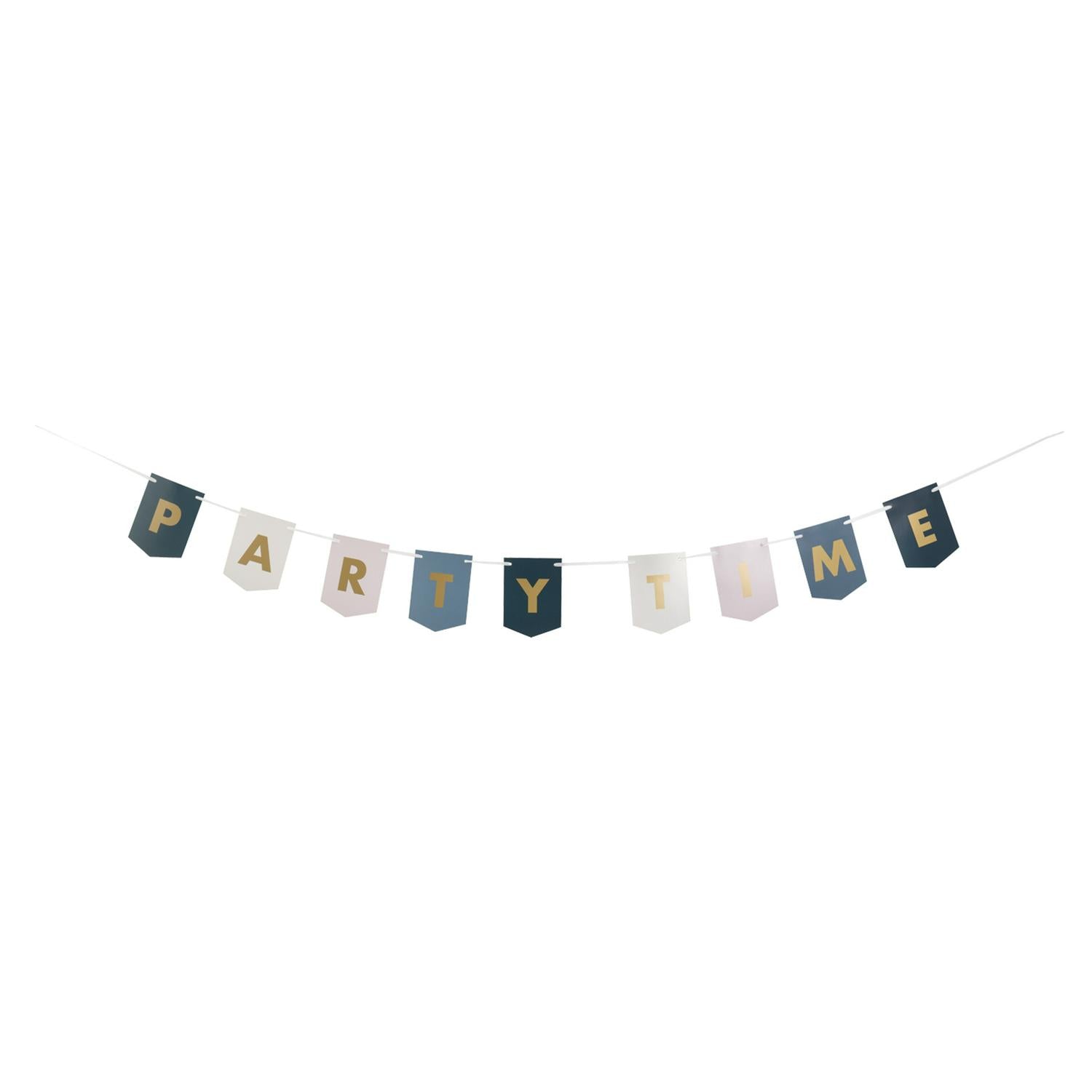This Habitat bunting adds a luxe touch to any event with its festive design. It features individual card flags printed with shiny gold lettering spelling out 'Party Time'. The flags are strung onto a white ribbon for easy decoration. This item is strictly for decorative use and is not a toy.