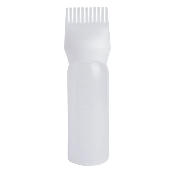 Hair oil dispenser bottle with comb attachment enables hands-free, thorough application directly to roots. Fill with oil, dye or hair mask then pump, and comb through. Sold empty, wash between uses.