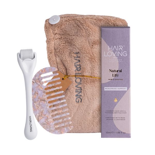 Menopause Hair Renewal Kit! Combat dry, brittle hair during hormonal changes.Includes hair oil, towel wrap, derma roller, and de-tangling comb. Heal, restore, embrace confident hair!