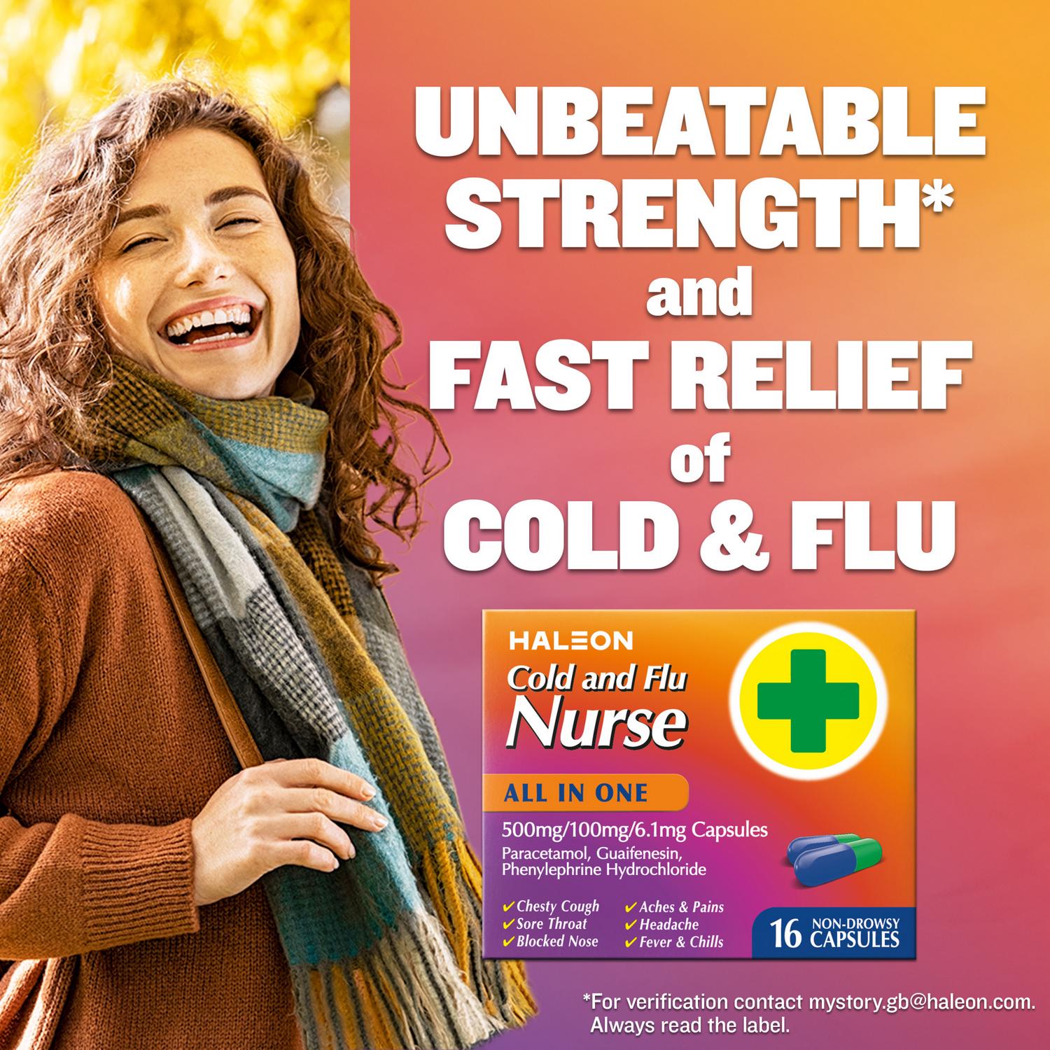 Haleon Cold and Flu Nurse All is One Capsules provide unbeatable strength*and fast relief of aches and pains of cold and flu During the challenging cold and flu season, it's useful to have a strong multisympton treatment by your side. Haleon Cold and Flu Nurse Capsules offer a formula designed to deliver relief from the cold and flu symptoms that can leave you feeling unwell, such as fever, sore throat, chesty cough, blocked nose, headaches, muscle aches and pains. In your battle against cold and flu, there's nothing stronger*. *For verification contact mystory@haleon.com Our triple-action non-drowsy formula alleviates your symptoms. Paracetamol not only eases your pain but also reduces your fever, bringing you welcome relief. Guaifenesin acts as an expectorant which loosens phlegm and relieves a chesty cough. Phenylephrine hydrochloride is a decongestant, effectively clearing your sinus and nasal passages and helping you breathe more easily. 1. EI: Haleon Cold and Flu Nurse All in One Capsules, contain Paracetamol. Always read the label. 2. EFFECTIVE: Nothing Stronger* for cold and flu relief *To verify contact mystory.gb@haleon.com 3. FOR COLD AND FLU: Relieves chest cough, sore throat, blocked nose, headache, aches and pains, fever and chills. 4. HOW TO TAKE THIS COLD MEDICINE: For adults aged 16 and over only : take 2 capsules every 4 hours as required. Do not take more than 4 doses in any 24 hour period. 5. QUANTITY LIMIT: You can only buy 2 products containing paracetamol or aspirin per transaction 6. Non-drowsy cold and flu relief