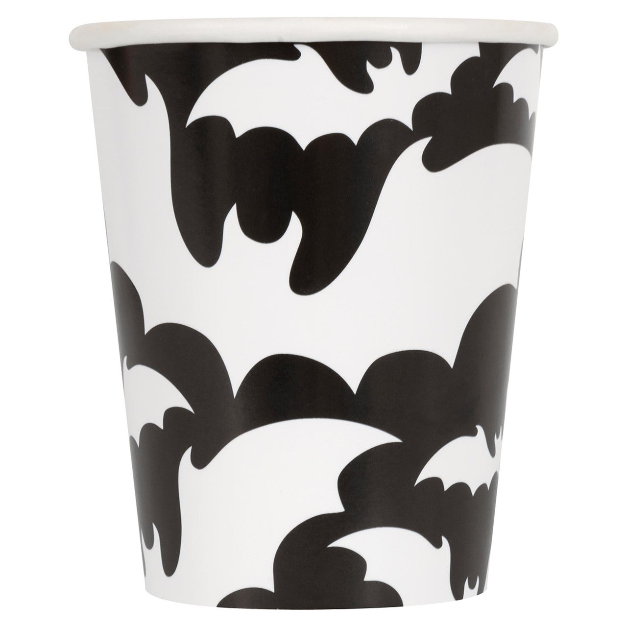 Prepare your table settings for the spooky season with this set of eight paper cups. Featuring a distinctive white and black bat motif, these items are ideal for serving drinks at any Halloween gathering. They offer a convenient, disposable solution for themed celebrations.