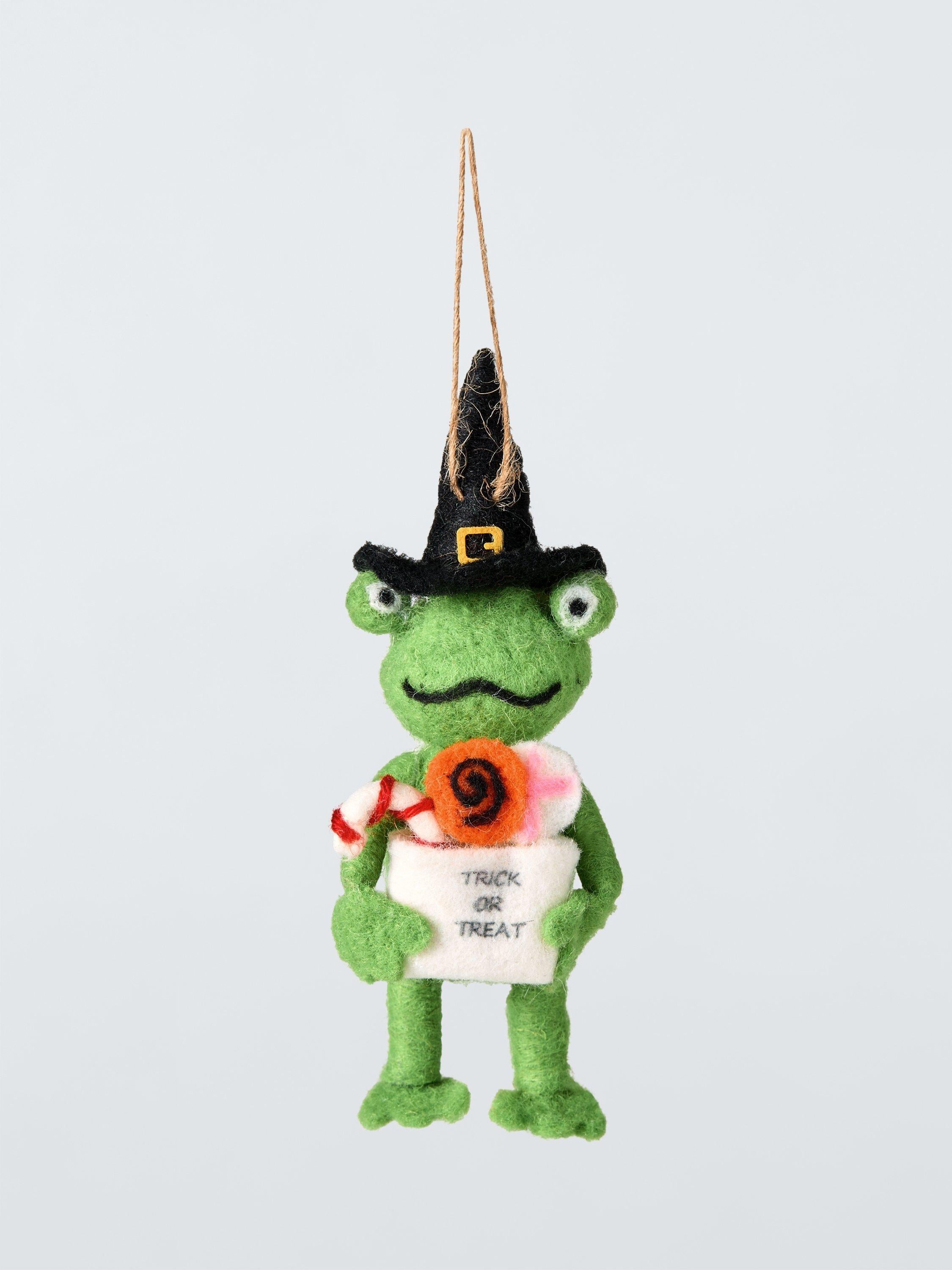 This cute felt frog is ready to go trick-or-treating in a witches hat and can be hung on a Halloween tree or anywhere around your home.