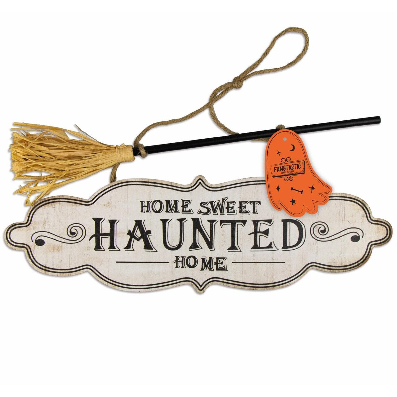 This Halloween Haunted Home Plaque is designed to welcome guests to seasonal gatherings with an appropriate spooky touch. Measuring 40x36cm, this decorative piece instantly enhances your entryway or party space. It features the festive greeting "Home sweet haunted home" written in a distinctly spooky typeface.