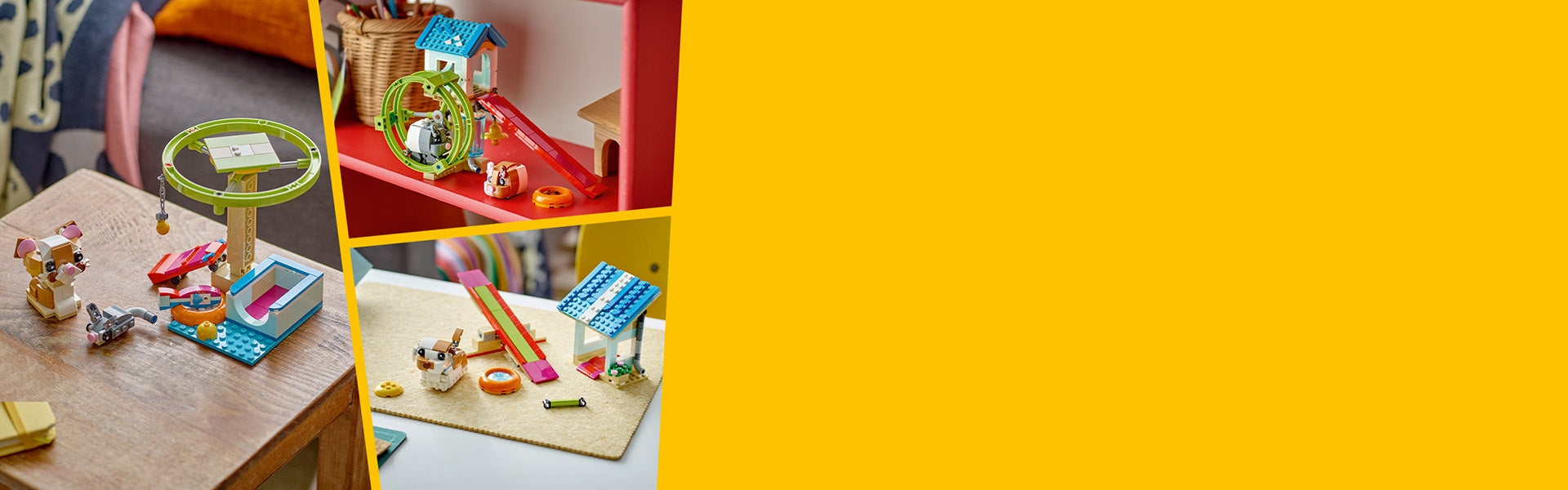 This LEGO® Creator set gives kids 3 different small animal toys to build using the same bricks. They can build a hamster toy playhouse, rebuild it into a play area for a cat with a spinning wheel and a skateboard or a doghouse where a dog can slide down a ramp and play with cool toys.