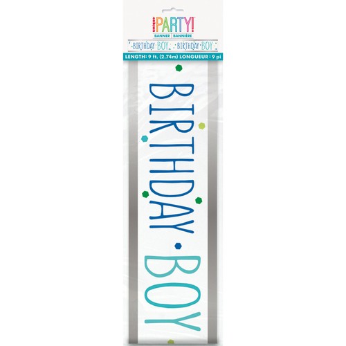 Prepare for a joyous occasion with this vibrant 9ft foil banner designed specifically for celebrating a birthday boy. This decoration instantly creates a festive atmosphere for any celebration space.