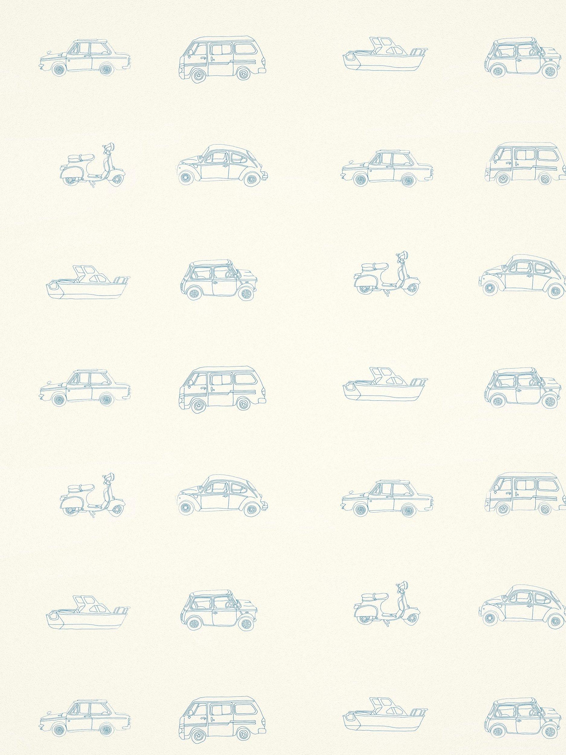 The Harlequin Go Go Retro Wallpaper Hltf112652 introduces a charming, lively design featuring numerous forms of transportation. This wallpaper clearly displays clever drawings of cars, boats, scooters, and camper vans, prepared for adventures across land and sea. It creates a dynamic, joyful accent wall.