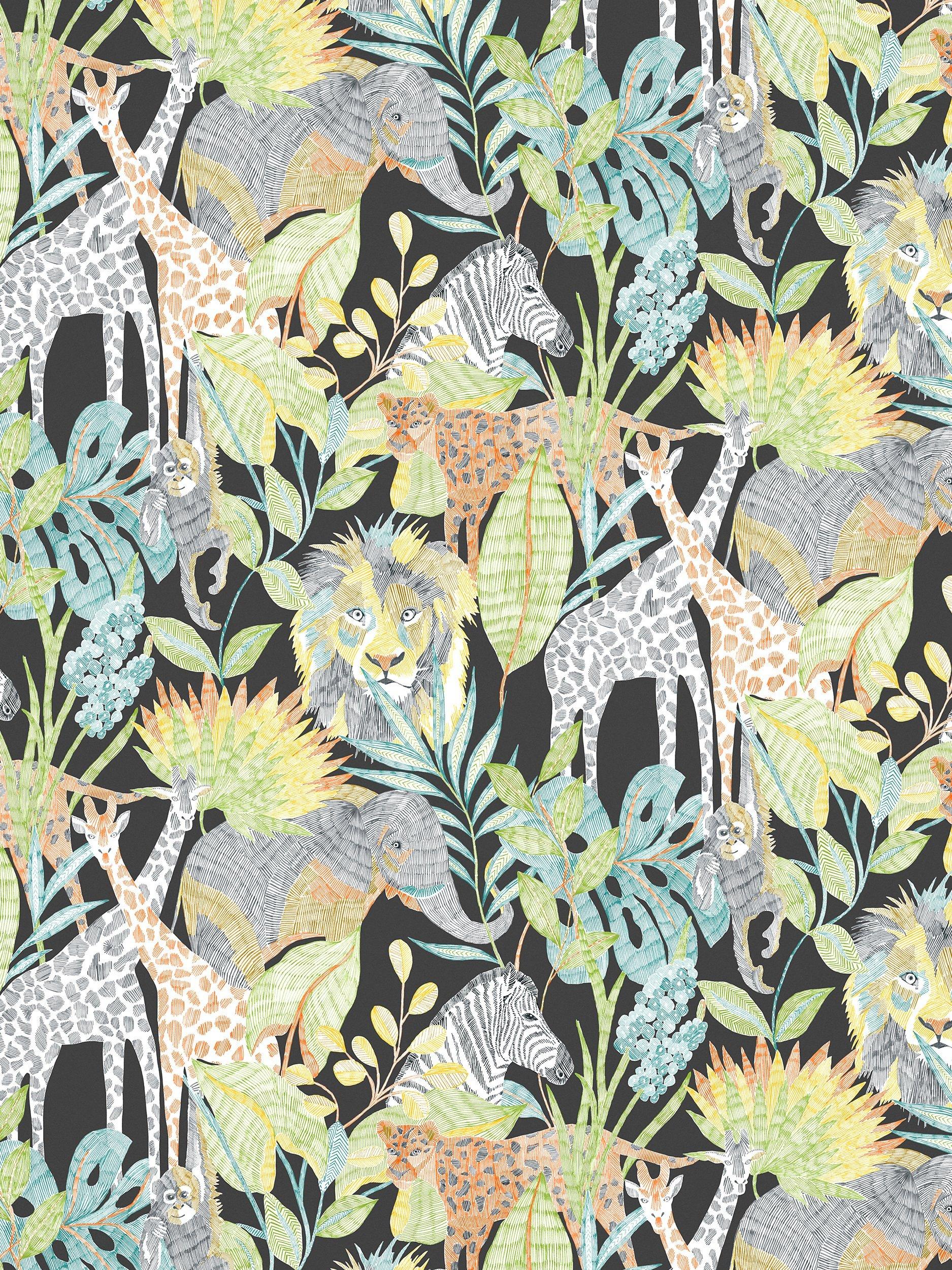 Explore the Harlequin Into The Wild Wallpaper Hltf112649, a captivating wall covering from the esteemed Little Home collection. This striking jungle-print design beautifully renders a midnight scene populated by majestic elephants, proud lions, friendly giraffes, and striped zebras. The detailed artwork simulates a unique hand-drawn, chalkboard-inspired aesthetic upon your wall surface.