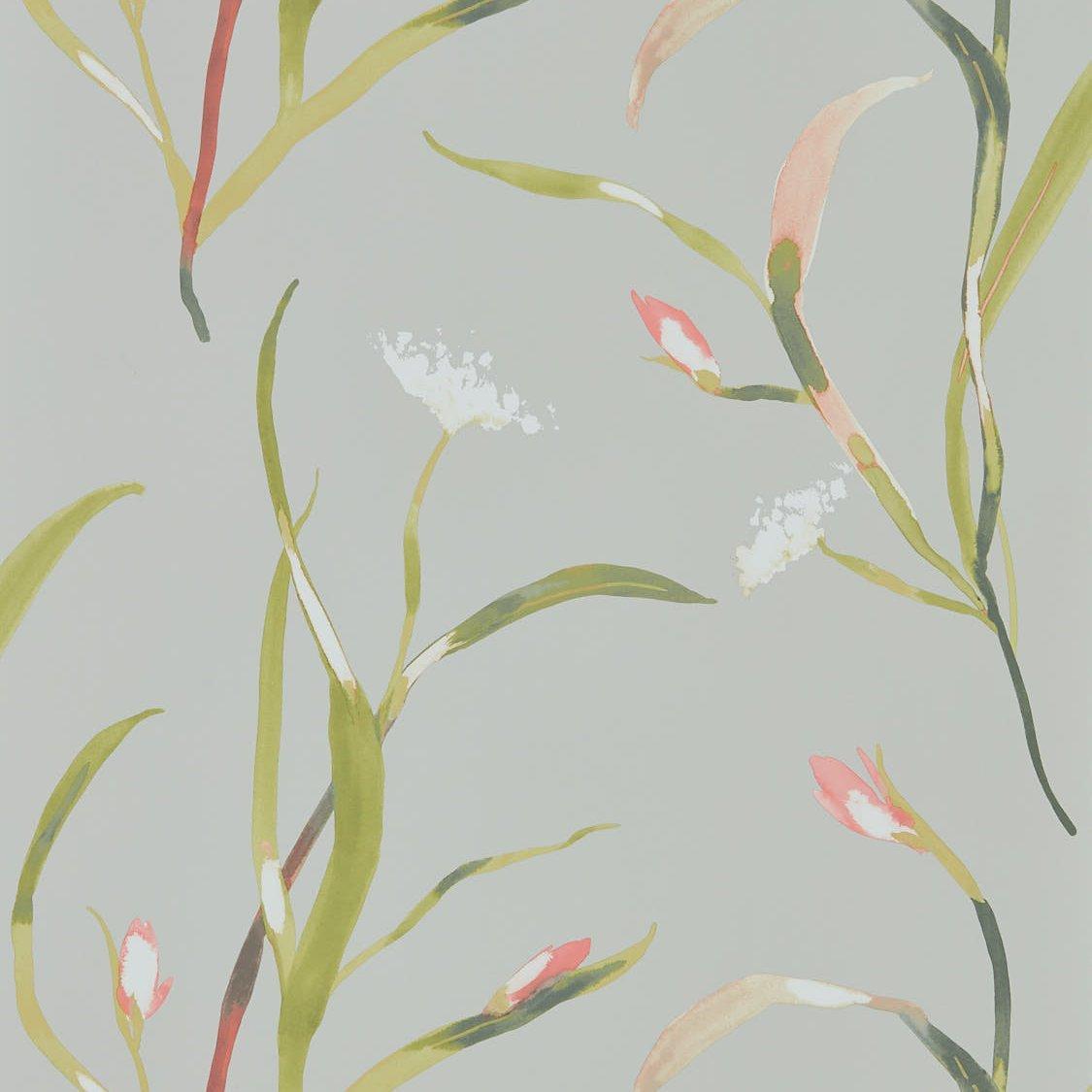 Harlequin Saona Wallpaper offers an elegant, abstract design featuring stylized flower heads reminiscent of irises and lilies. This quality wallpaper, proudly made in the UK, captures serene pondlike motifs beautifully within its pattern. It is ideal for creating a stunning focal point or feature wall within any modern interior setting.