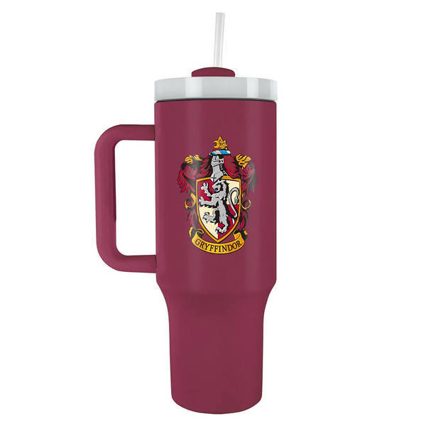 Sturdy. Height: 27cm. Width: 10cm. Design: Crest, Gryffindor, Printed. Double-Walled, Hand Grip, Insulated, Keeps Drinks Cold, Keeps Drinks Hot, Soft Touch, Spout Lid, Thermal.