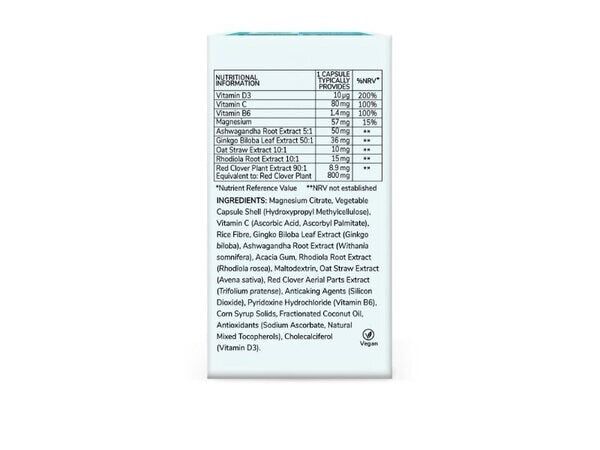 Magnesium (Citrate), Ashwagandha Root (withania somnifera) (5:1 Extract), Vitamin C (Ascorbic Acid, Ascorbyl Palmitate), Gingko biloba (Gingko Biloba leaf) (50:1 Extract), Rhodiola Root (Rhodiola rosea root) (10:1 Extract), Avena Sativa (avena sativaL. straw) 10:1 Extract (Oat) Red Clover (Trifolium pratense L. close) (90:1 Extract), Rice Concentrate, Vitamin D3 (Cholecalciferol), Vitamin B6 (Pyridoxine Hydrochloride).