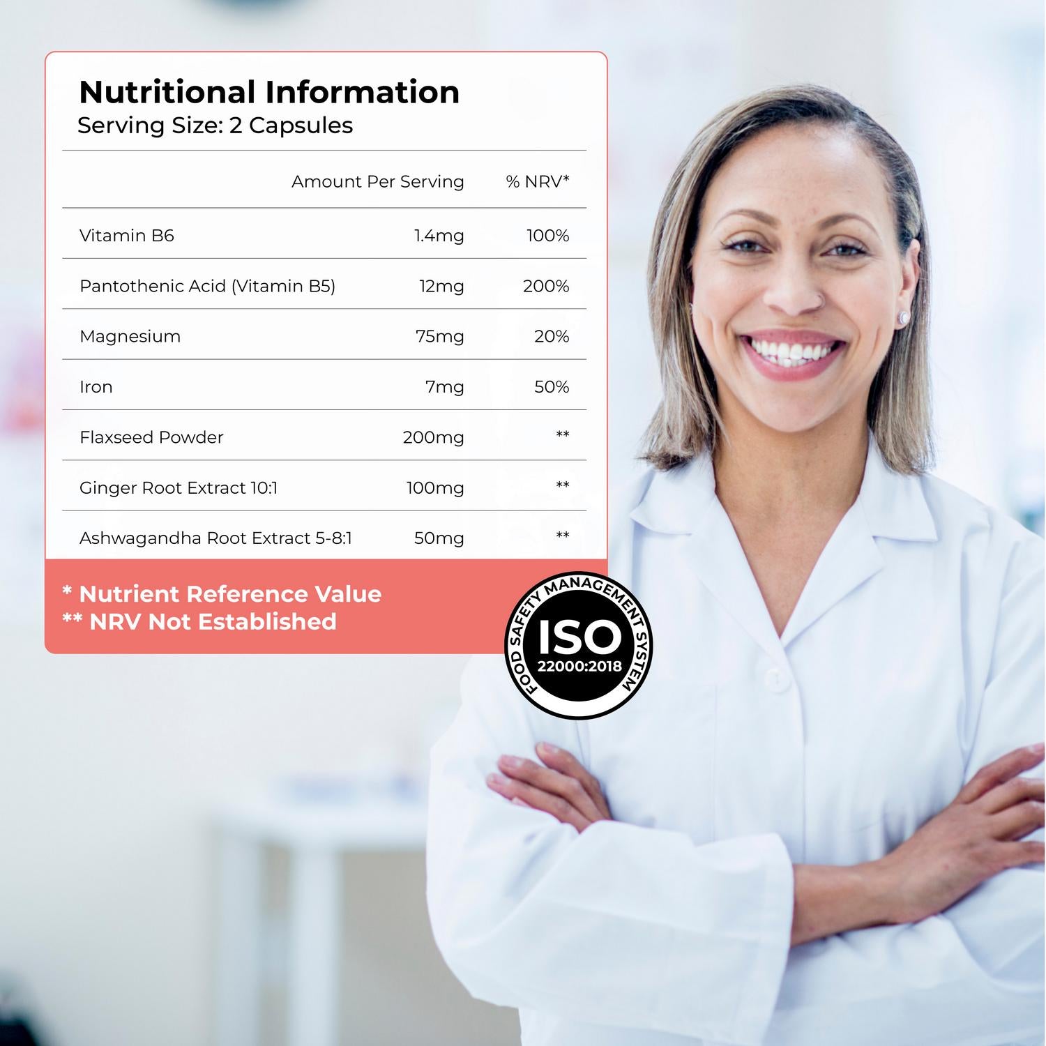Designed to support wellbeing during the menstrual cycle in 5 ways Hormone Regulation Vitamin B6 contributes to the regulation of hormonal activity Energy Vitamin B6 and magnesium contribute to the reduction of tiredness and fatigue and support a normal energy-yielding metabolism Nervous System Vitamin B6 and magnesium contribute to normal functioning of the nervous system Cognitive Function Iron contributes to normal cognitive function Immune System Vitamin B6 and iron contribute to the normal function of the immune system Contains a blend of vitamins, minerals and active botanicals developed to support wellbeing during the menstrual cycle
