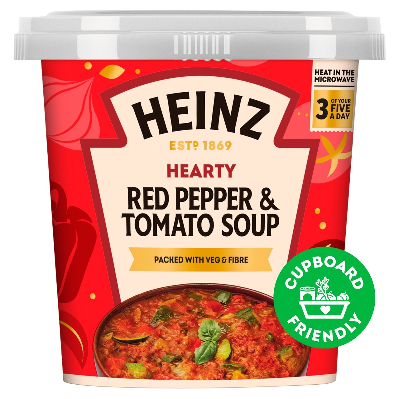 This Heinz Tomato & Red Pepper soup provides a quick and warming meal option, conveniently ready after heating in the microwave. This low-fat recipe is packed with vegetables and fibre, supporting your daily nutritional goals effectively. It is a practical choice for a simple lunch or snack.
