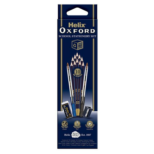 Product details Description A complete stationery set, ideal for school. • Premium quality Helix Oxford branded products. • 10 x HB pencils. • Blue and black ballpoint pen. • Sleeved eraser and a pencil sharpener. • PVC free eraser and safety screw on pencil sharpener. • Plastic free packaging. Customer... Read More