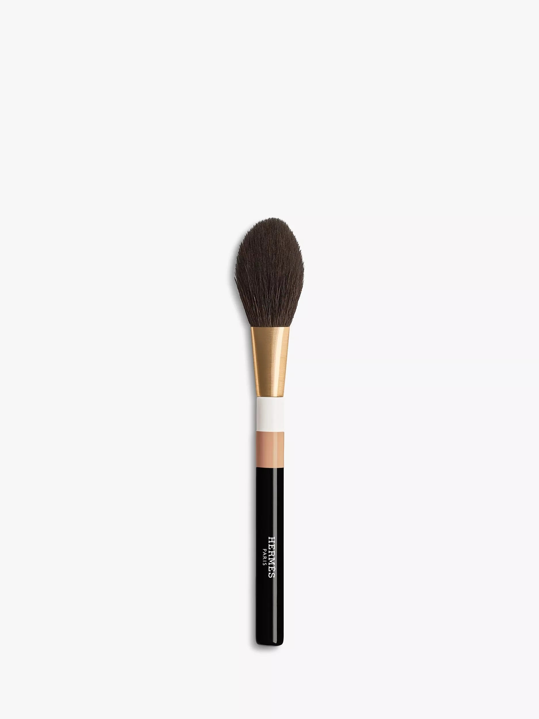 This precious object with a three-coloured handle in lacquered wood sits comfortably in the hand. The ultra-soft natural goat hair fibres are hand-assembled by a French brush-maker.