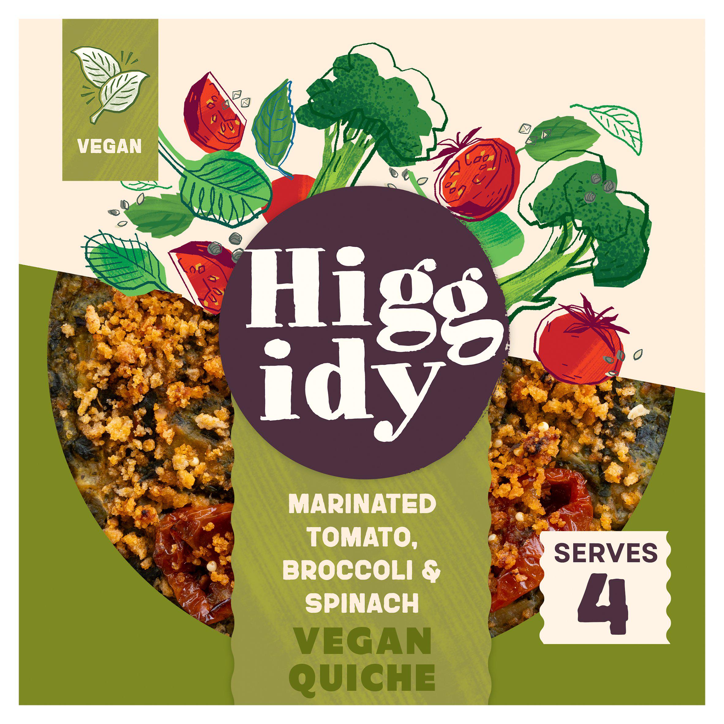 Seeded spelt shortcrust pastry with broccoli, spinach and basil in a creamy oat filling, hand-topped with roasted tomatoes and a SunBlush tomato crumb.