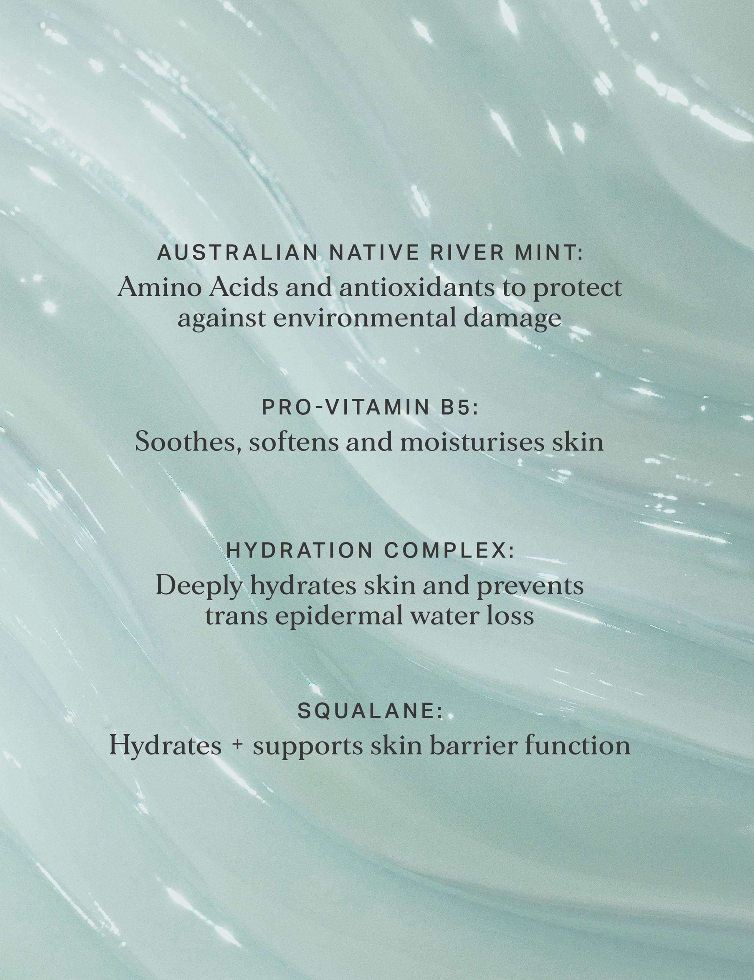 Australian Native River Mint: Loaded with natural Amino Acids and antioxidants, this locally sourced botanical helps prevent oxidative stress, support Collagen production and improve skin hydration and barrier function