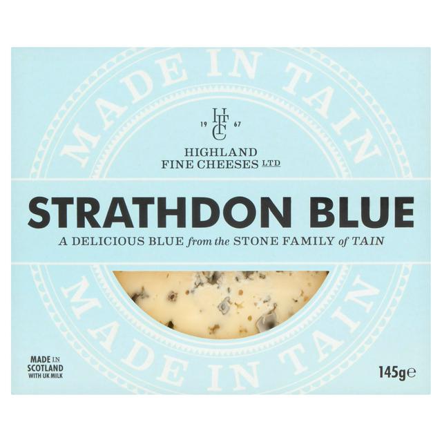This Strathdon Blue Cheese, presented in a 145g pack, is a soft, mould-ripened delicacy originating from the Stone Family of Tain. It provides a distinctive, satisfying flavour profile for cheese enthusiasts. This cheese is also listed as suitable for vegetarians.