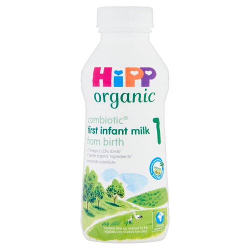A nutritionally complete* whey based infant milk ready to feed liquid formula. *As required by the legislation of all infant formula, Suitable from birth if your baby is being bottle fed or to complement breastfeeding, With gentle organic ingredients (gentle because no pesticides are used in the pastures where our cows graze), Contains Omega 3 DHA (as required by the legislation for all infant formulas), An easy eco choice in a convenient format, organic ingredients, recyclable bottle and using plant based inks, Family owned since 1899, Stefan Hipp personally guarantees every product we make, just as his family has done for over 120 years