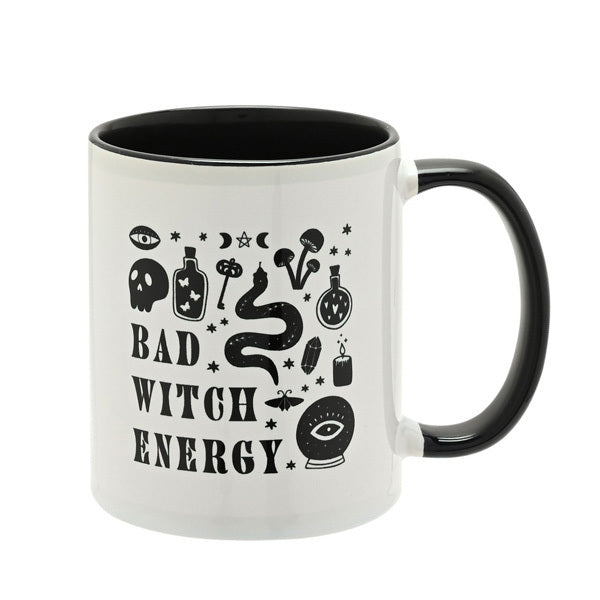 Product Information a bad witch energy black handled mug in stoneware and a glazed finish this classic mug strikes a playful tone with bad witch energy wording and witch motifs