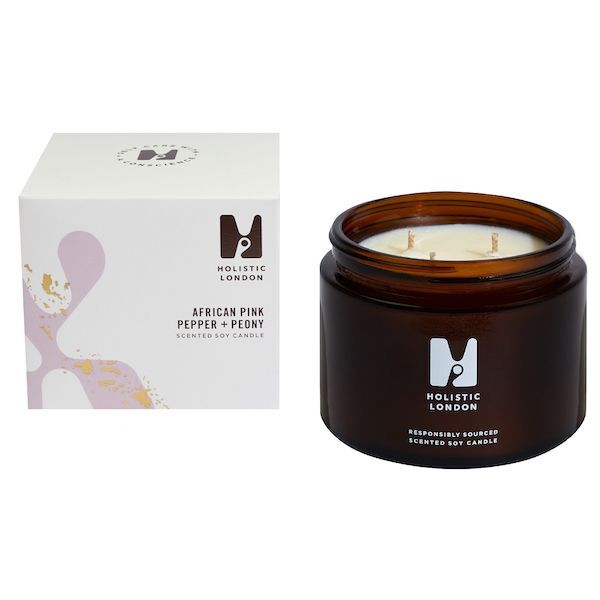 This handcrafted soy candle from Holistic London features an indulgent aroma blending Pink Pepper and Peony for wellbeing support. The spicy profile mixes well with florals, creating an invigorating and welcoming scent in any room.