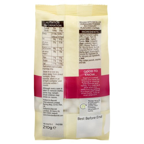These yoghurt flavoured coated raisins offer a pleasant alternative to traditional chocolate treats. The coating expertly encases juicy raisins, providing a satisfying sweet crunch in every bite. This snack is suitable for grazing when you feel the need for a small, satisfying bite. They also contain Bacillus Coagulans powder, which is a source of friendly bacteria.