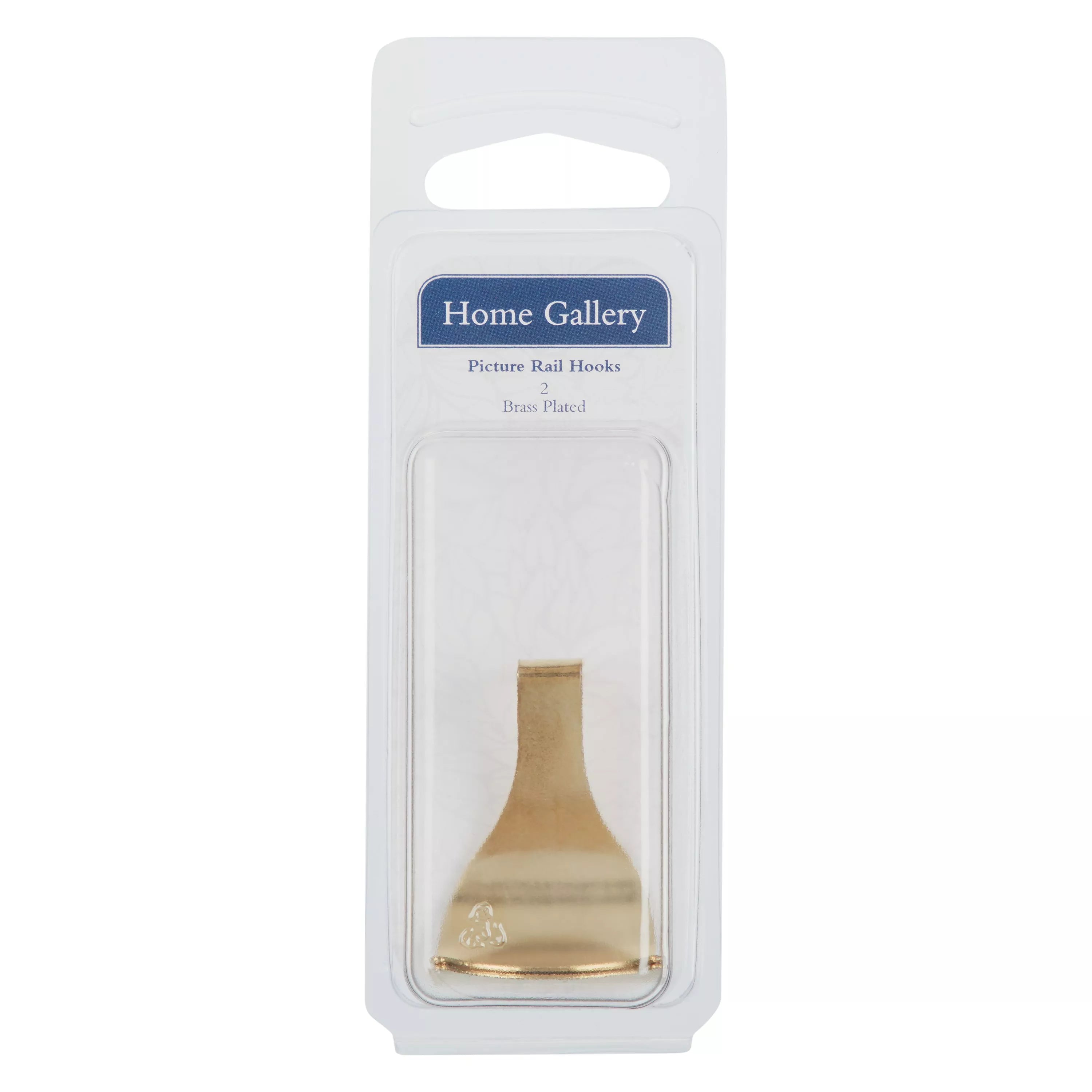 Pack of 2 brass plated picture rail hooks. Use with chain, wire or cord.