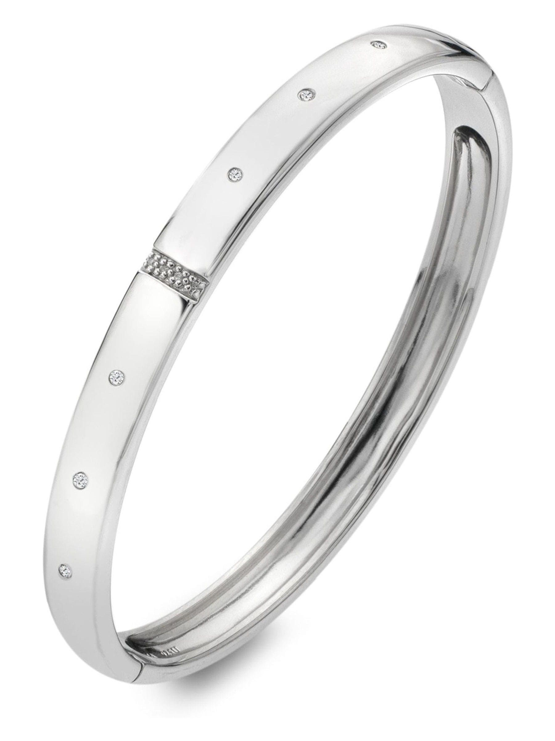 4 diamonds? We're in! This bangle is sure to be a favourite. Crafted in sterling silver and rhodium plated for longevity, this bangle has a handy hing mechanism making it very easy to take on and off. Although we'll be leaving ours on! The diamter of the bangle is 60mm.