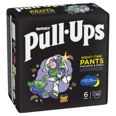 Product InformationHuggies Pull-Ups Night Time Training Pants are perfect for maintaining consistent potty training routines at night. With up to 12 hours of night-time protection, your little adventurer will love wearing Huggies Pull-Ups. With a super soft and stretchy 360˚ waistband, watch as they start practising pulling their pants up and down by themselves in no time. These pull-up nappies are comfortable and flexible to wear - meaning your little explorer can wriggle in their dreams to their heart's content. Huggies Pull-Ups Night Time Training Pants feature an extra absorbent layer for all-night dryness and protection. With unique learning features and advanced technology, Huggies Pull-Ups help big kids learn wet from dry - the design fades when wet to signal if an accident has happened overnight. Huggies recognises consistency is important for potty training. That‘s why Huggies Pull-Ups Night Time Training Pants are perfect to use alongside Huggies Pull-Ups Day Time Training Pants for easy toilet training, both day and night. Help your Big Kid say goodbye to nappies with Huggies! All night protection - Our night time nappy pants feature an extra absorbent layer for overnightprotection. Help your kids maintain consistency during their potty-training journey, both day and night. Advanced technology - A wetness indicator in these nappy pants fade when wet to teach your big boys the difference between wet and dry. Huggies® Pull-Ups® are made by Kimberly Clark, the same company who proudly brings you other household favourites such as Andrex® toilet roll and Kleenex® facial tissues. Comfy and practical - Huggies Pull-Ups have our best ft ever and are easy to pull on and tear off. Perfect for fast removal for quick clean ups - so your Big Kid can keep jumping, playing, and exploring.