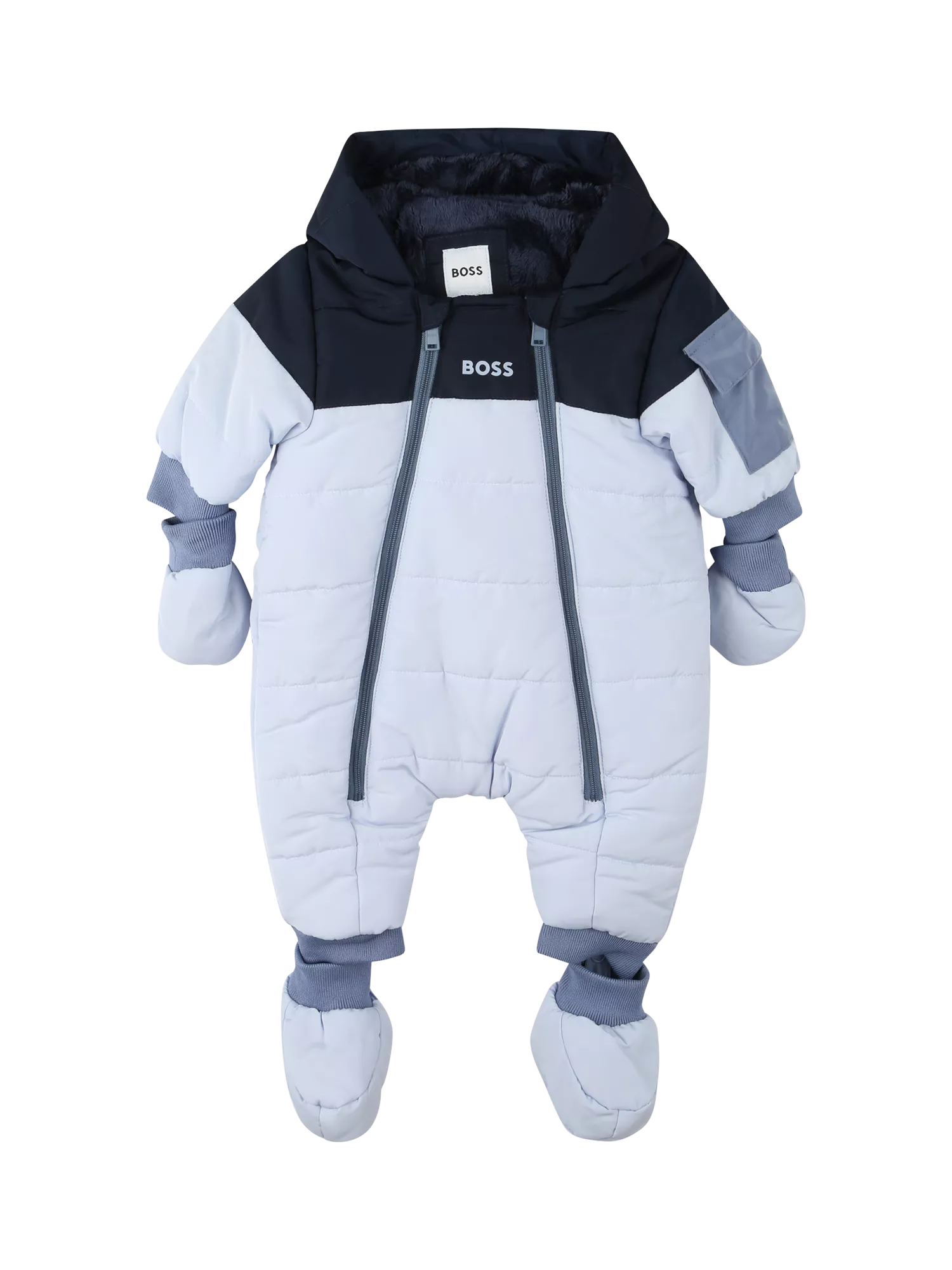 This snowsuit is lined with cosy faux fur. Designed with a contrast hood, double zip closure and removable mittens and booties. Finished with Boss branding.