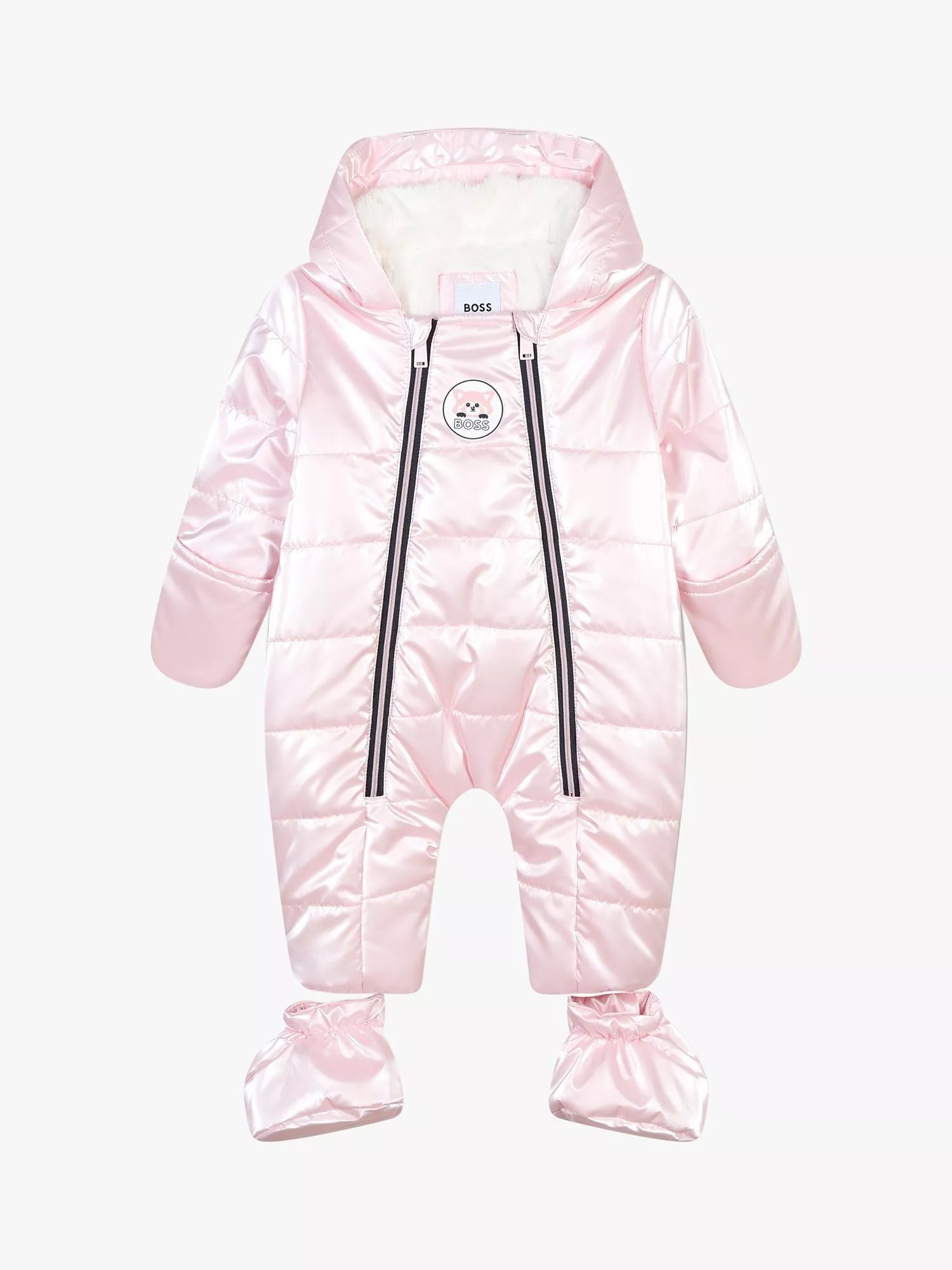 This water repellent, pearlescent effect snowsuit is lined with cosy faux fur. Designed with a matching hood, double zip closure, semi-removable mittens and removable booties. Finished with Boss branding.