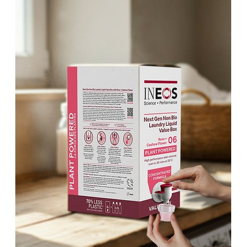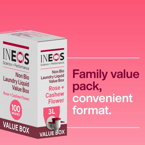 INEOS delivers high performance cleaning, scientifically optimised to tackle tough stains effectively in modern laundry conditions. This concentrated non bio laundry liquid uses plant-based cleansers to ensure excellent results without harsh additions. The XXL value box provides 100 dependable laundry cycles for your household.
