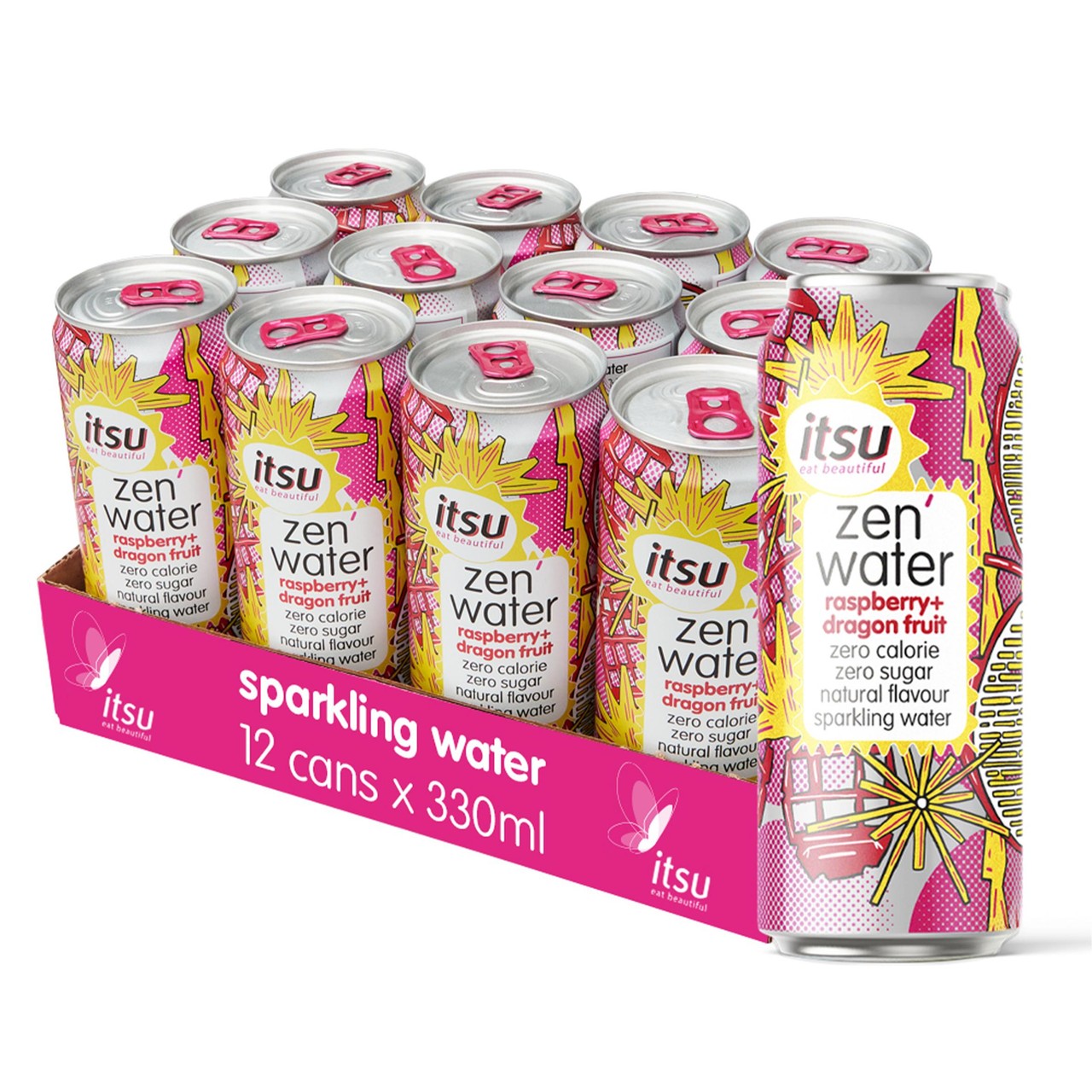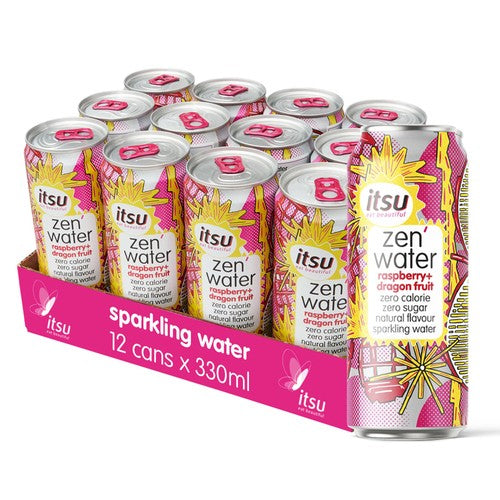 Enjoy the light and crisp refreshment of Itsu Raspberry and Dragon Fruit Zen Water. This pack contains sparkling water blended with natural fruit essences for a delightful taste experience. It offers a simple, health-conscious option for daily hydration throughout the week.