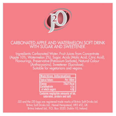 FeaturesA refreshing blend of fresh apple, cool watermelon and a dash of bubbles. Two delicious fruits, blended in one irresistible drink. Low in calories with only 20kcal per 100ml.