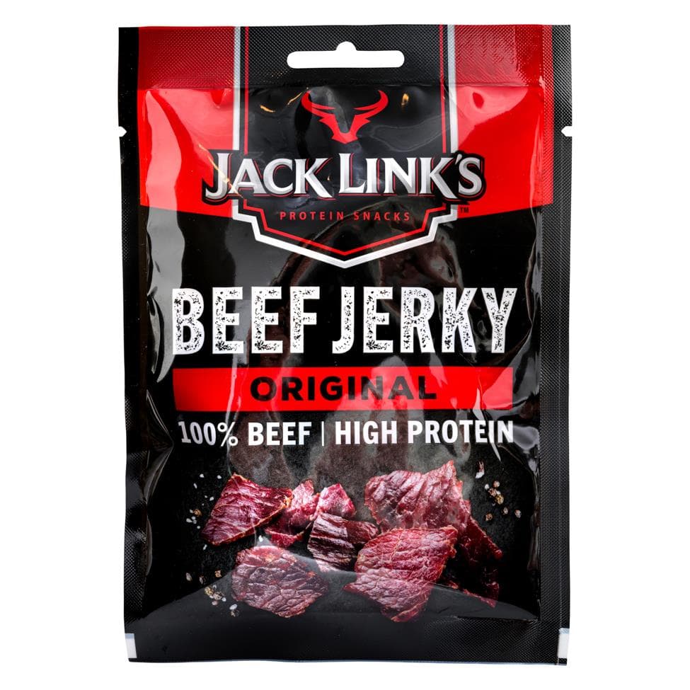 Jack Link\u2019s Meat Snacks Beef Jerky in the original flavour offers a savoury and satisfying snacking experience. Made from select rump beef, cut into thin strips and seasoned with a special family recipe using carefully selected ingredients, this jerky is slow-cooked to perfection. The thin beef strips are dried and smoked slowly in hot air, following the traditional method. The result is a tender, flavourful snack that provides a convenient and delicious option for any time of day. Enjoy the bold taste of premium beef with every bite of this classic jerky snack.