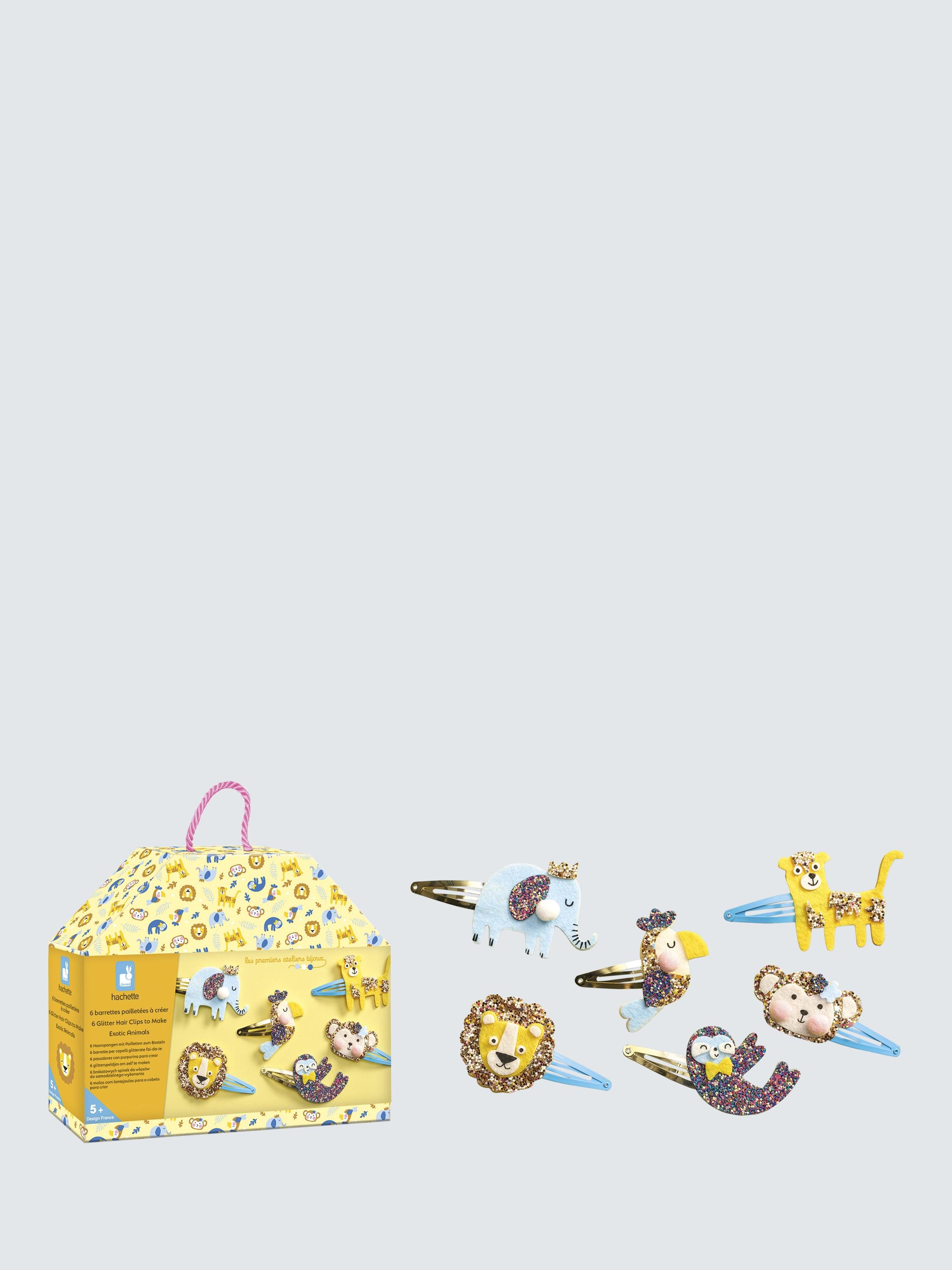 Read MoreJazz up the jungle! This craft kit can be used to make 6 glittery jungle animal-themed hair clips: an elephant, lion, leopard, toucan, sloth and monkey. The adorable printed box boasts an ultra-portable bag shape and includes 6 hair clips (5 cm each), 3 sheets of pre-cut self-adhesive felt, 2 sheets of pre-cut self-adhesive glitter material, 4 pompoms, double-sided sticker dots and 1 booklet containing the instructions and models. This activity helps develop dexterity and patience, and takes around 10 minutes to complete each hair clip. It is ideal for children aged 5 and over.