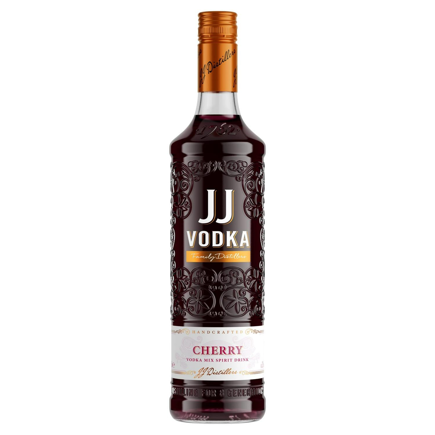 JJ Vodka Cherry Vodka Mix Spirit Drink is handcrafted by family distillers, presenting a bold look with its deep cherry-red hue and premium 100cl bottle. This spirit offers a rich and indulgent flavour profile, making it a timeless choice for various mixed drinks and cocktails. It is designed to stand out on any shelf or back bar with its eye-catching presentation.