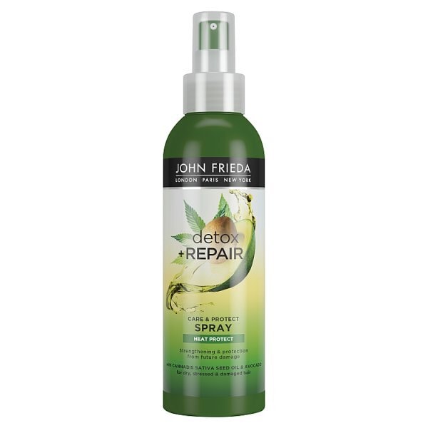 your hair is exposed to many daily challenges that could make it look stressed and lifeless styling product build up and environmental influences can strain hair and can reduce the effect of caring ingredients the john frieda detox repair collection frees up your hair from unwanted impurities and creates the perfect foundation for visible repair and immediate revitalisation transform dry stressed hair into healthy looking hair full of smoothness and shine detox repair care protect spray strengthens and protects hair from breakage and split ends the nutrient rich formula provides the hair with moisture and smoothness and detangles gently with antioxidant rich green tea and nourishing avocado oil