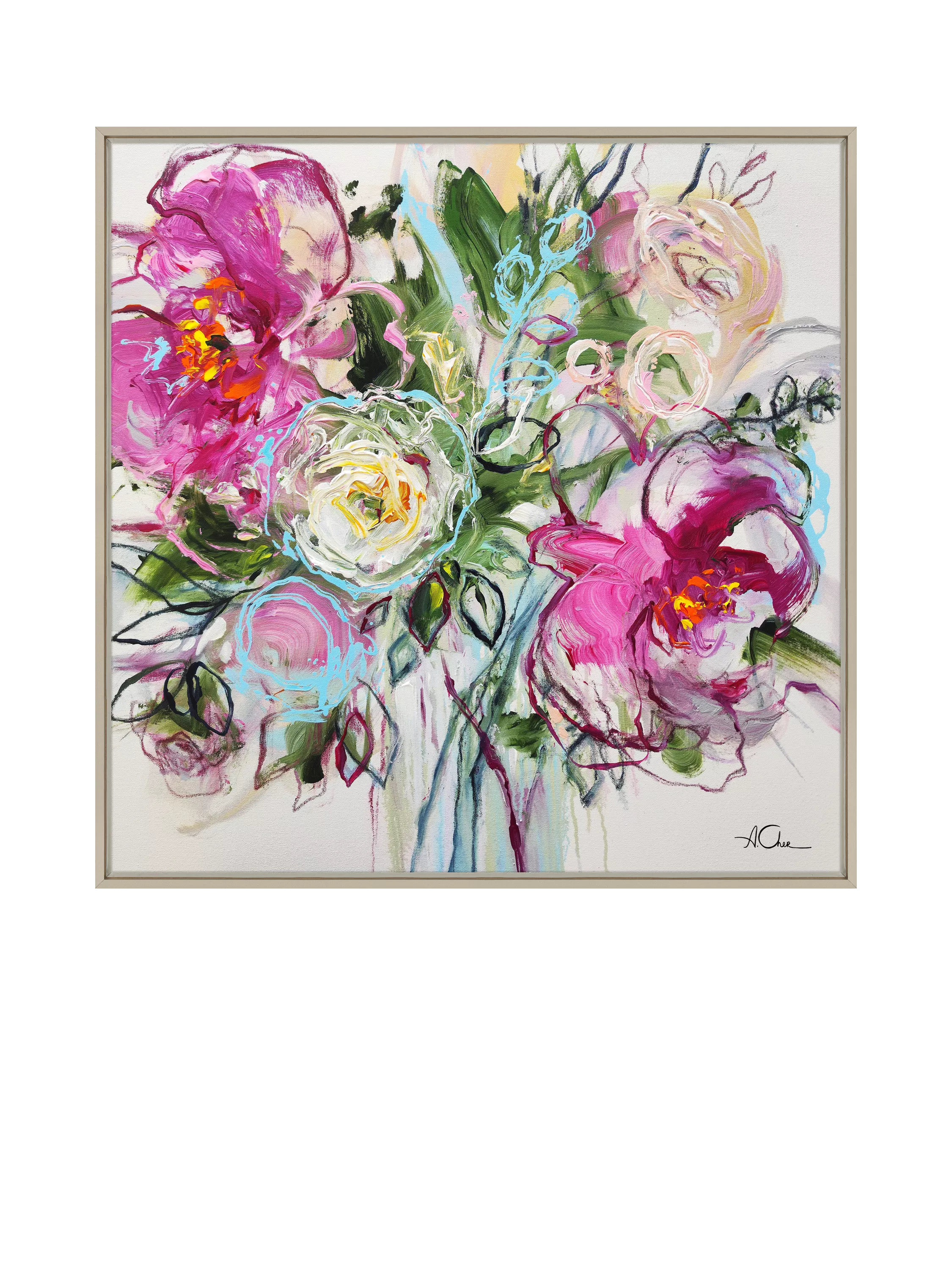 Bold strokes and vibrant colours are the main focus of this floral artwork by artist Anna Cher. Made in the UK, this stretched canvas print has a champagne-coloured frame and is ready to hang on your wall.