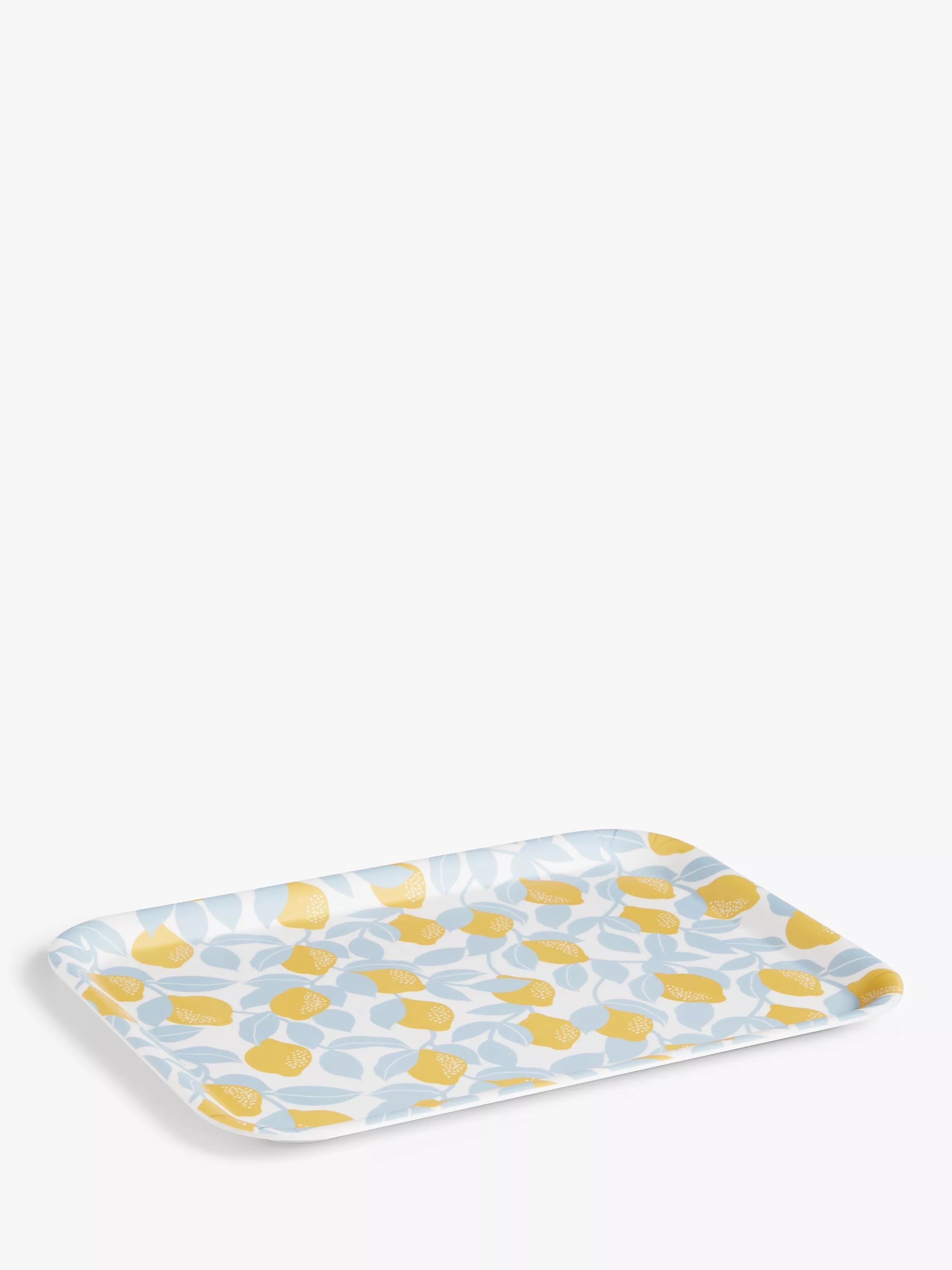 When life gives you lemons, you draw them and add the pattern to a tray. At least that's what we did here. Made of melamine, this lightweight tray is easy to carry and wipe clean. And it's covered in sunny citrus fruit motifs. The raised sides keep biscuits and snacks from sliding off the tray when it's time for afternoon tea.