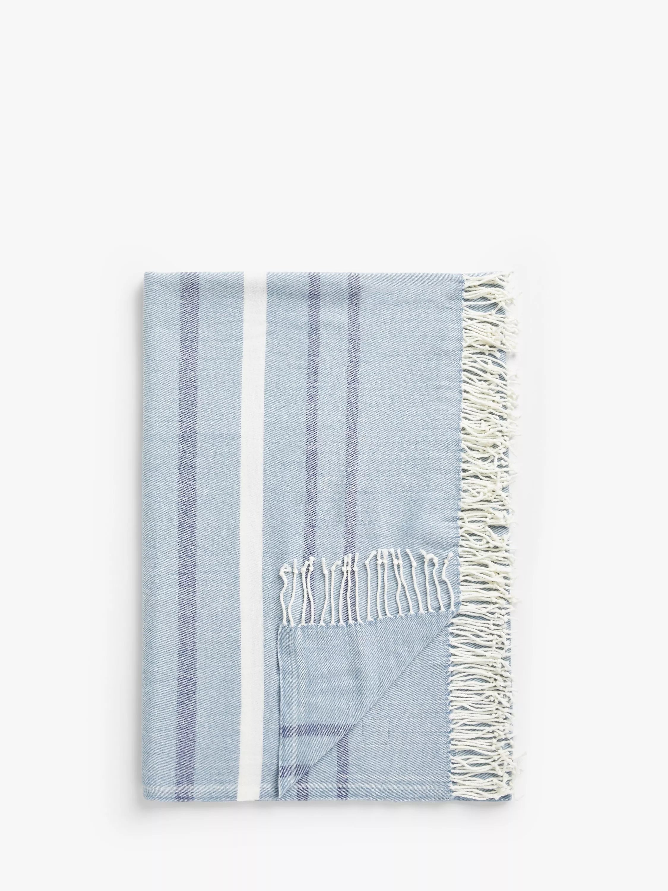 A soft, woven stripe throw, woven in shades of blue and finished with a fringed edge.