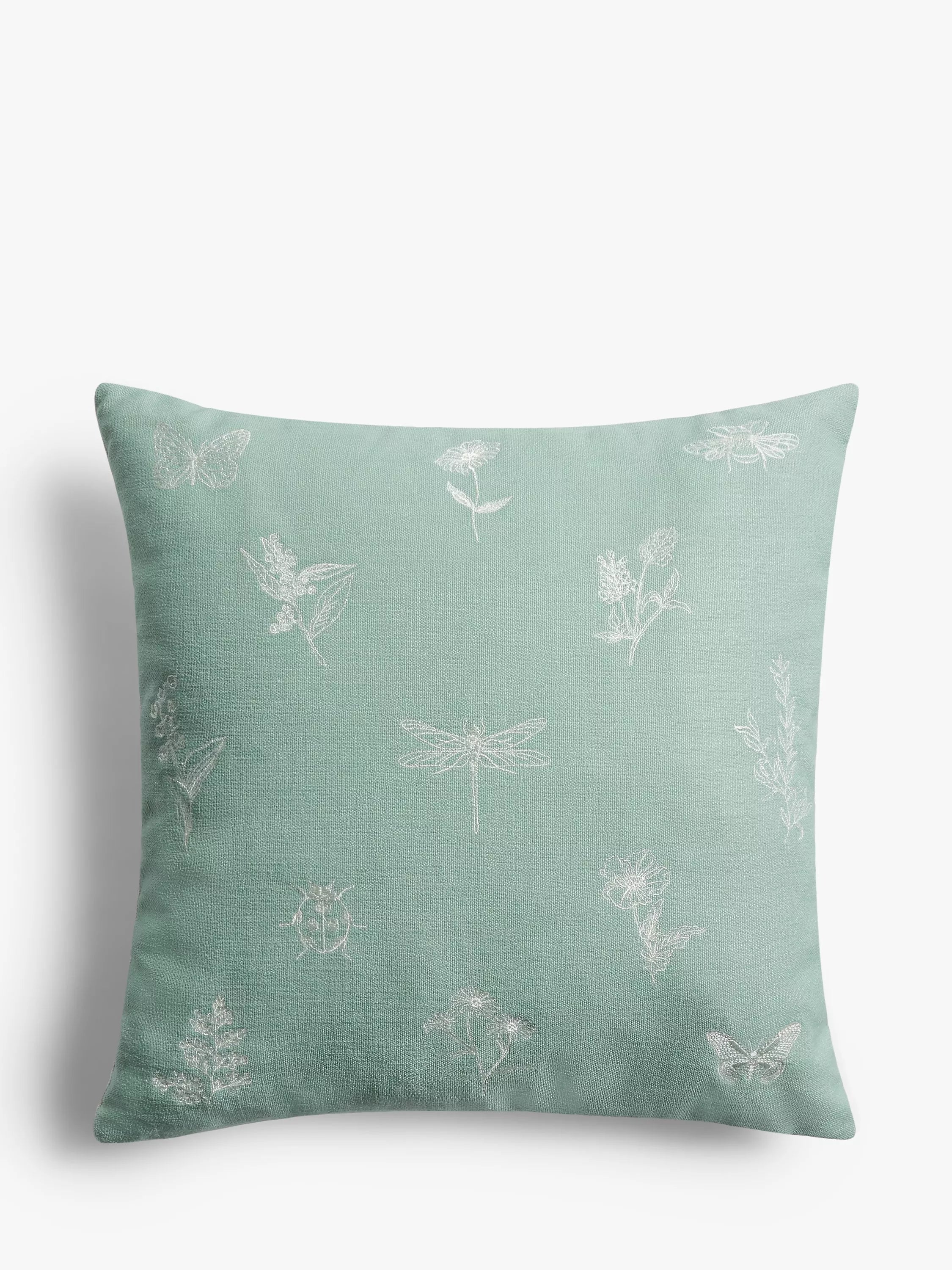 This cushion features a charming embroidered design of flower sprigs and garden insects.