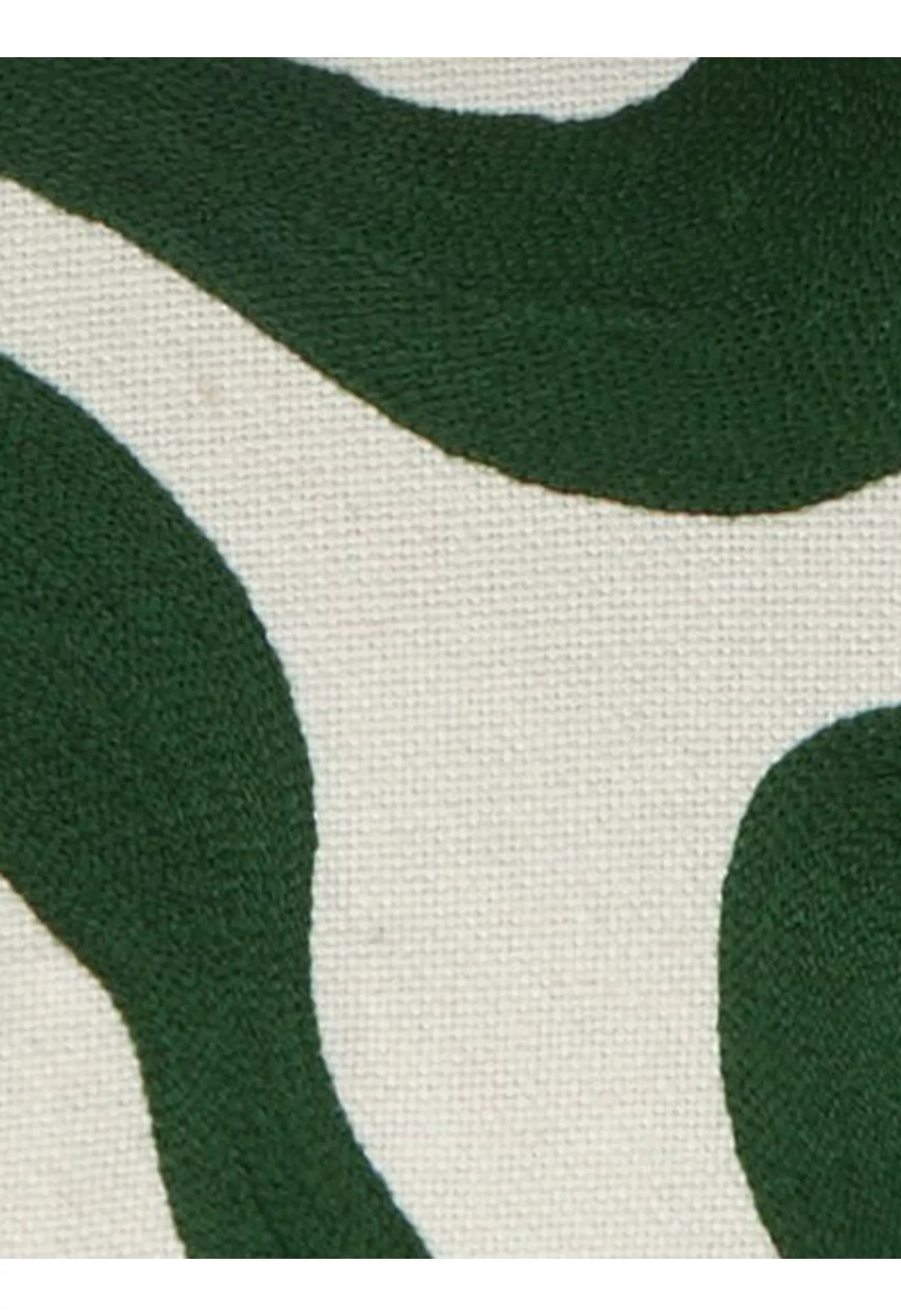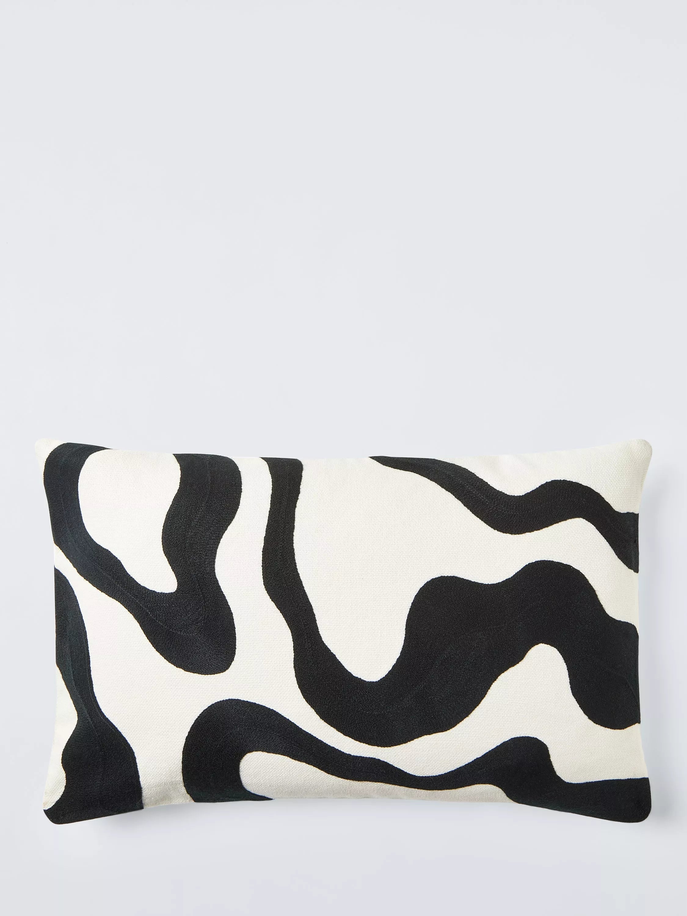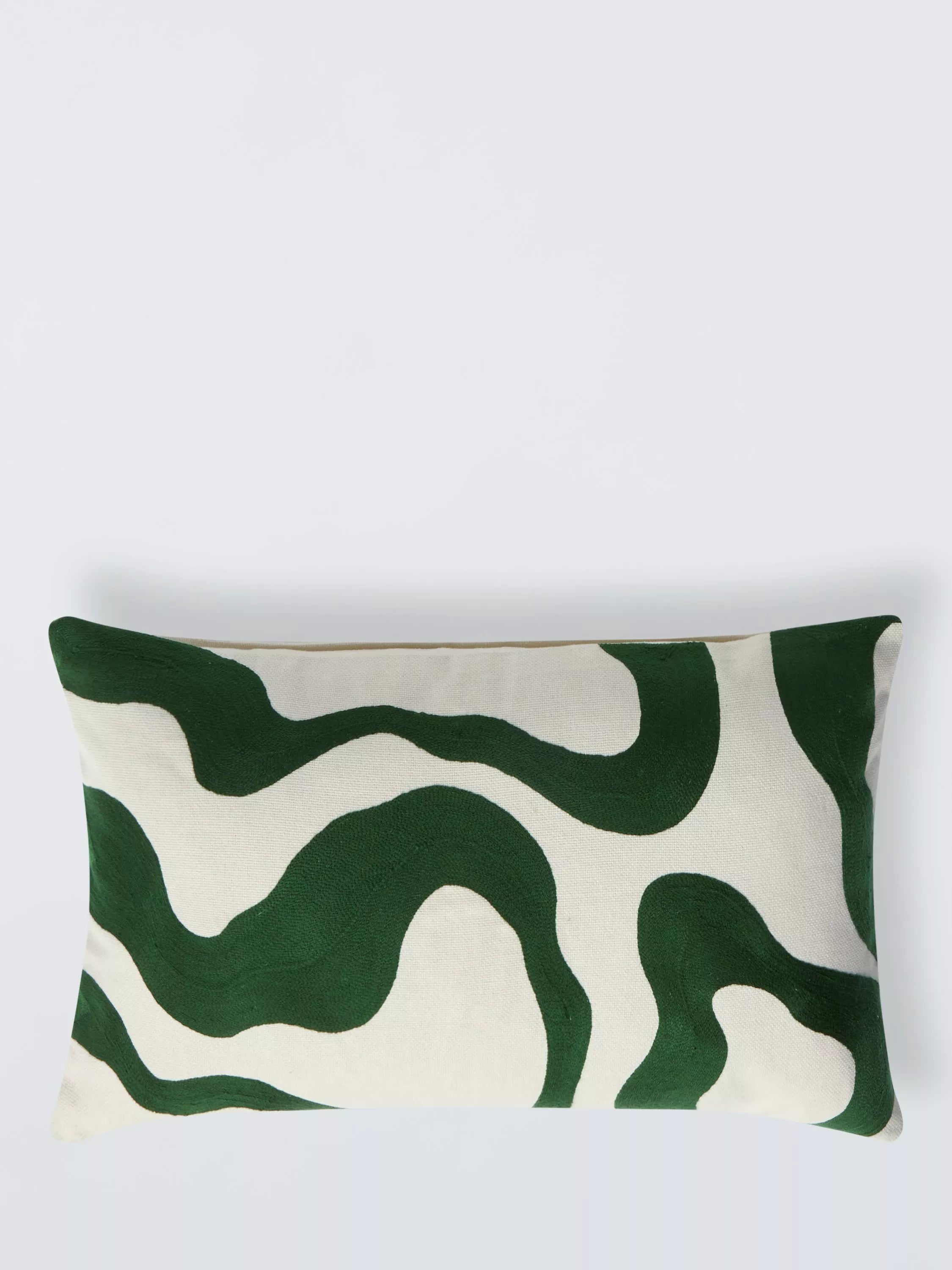 This contemporary cushion has a hand guided, embroidered swirling pattern reminiscent of light on water, or patterns in sand, stitched onto a natural background. The reverse is plain.