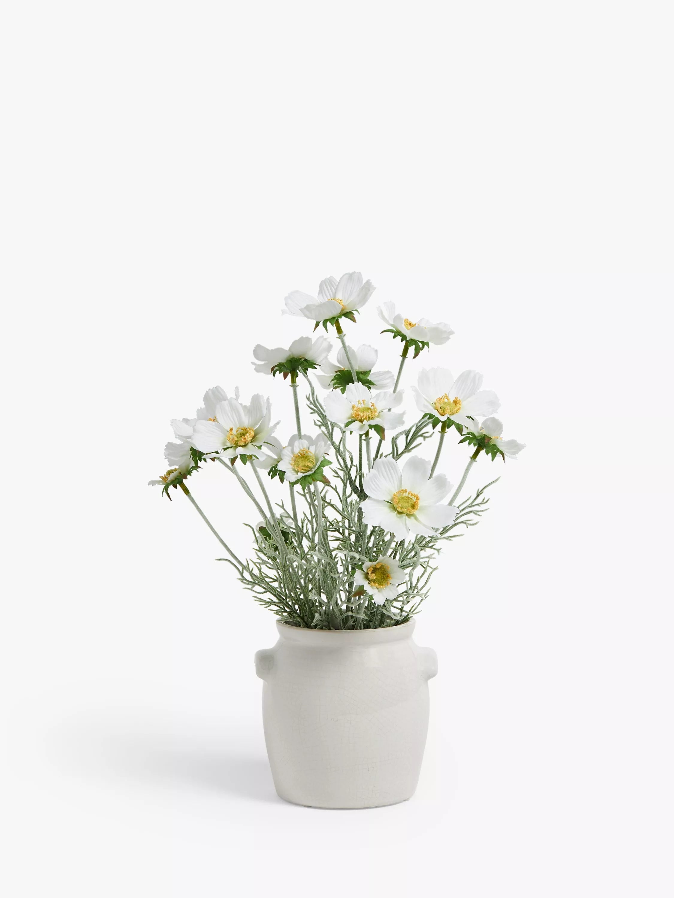 Flowering late summer and well into autumn, Cosmos are breathtaking in the garden. Enjoy them year-round at home with these artificial cosmos in a crackle glaze ceramic pot. Very low maintenance — just give it a little dust now and then.