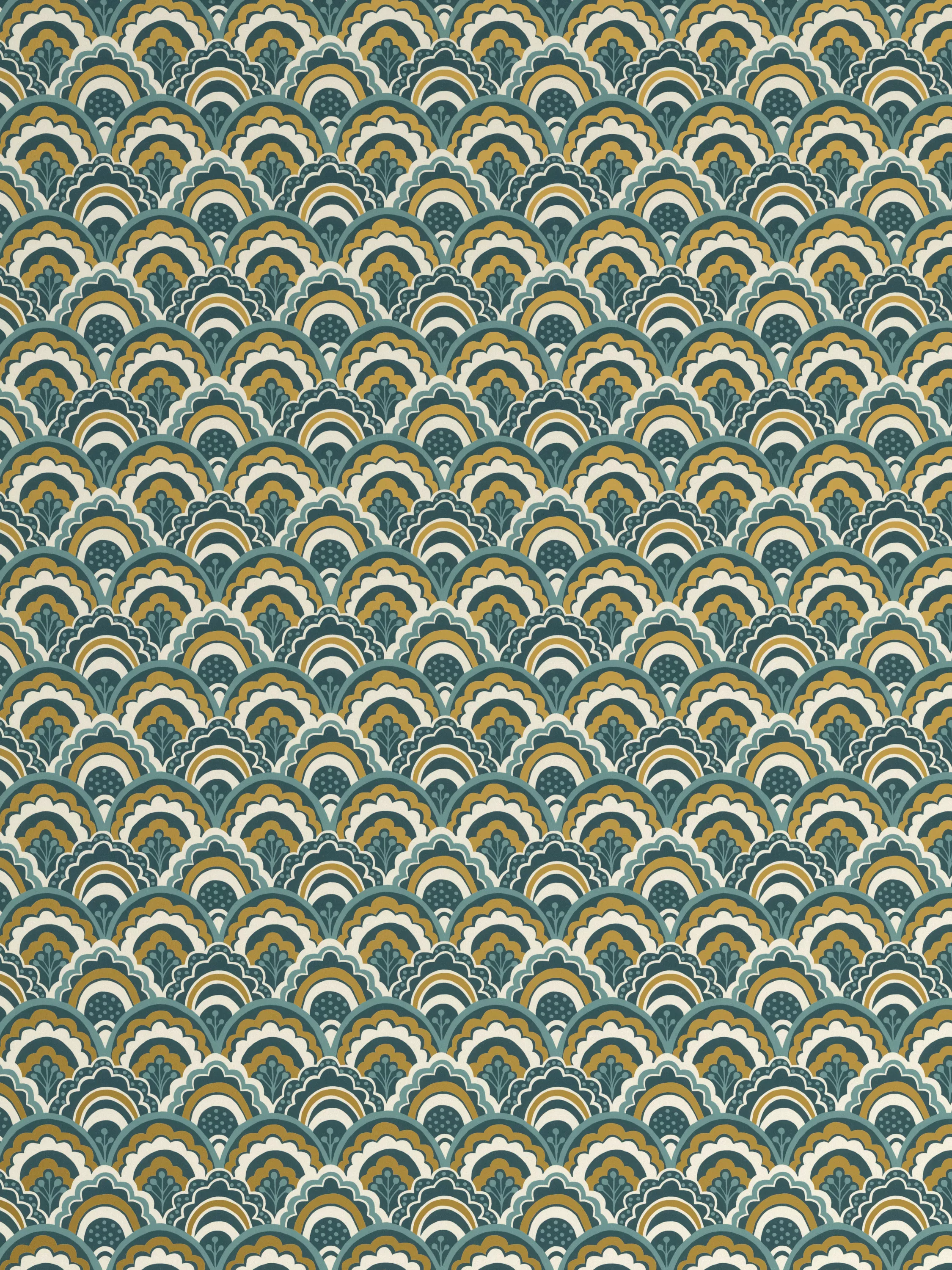 A dramatic peacock feather design in shades of green, teal and yellow.
