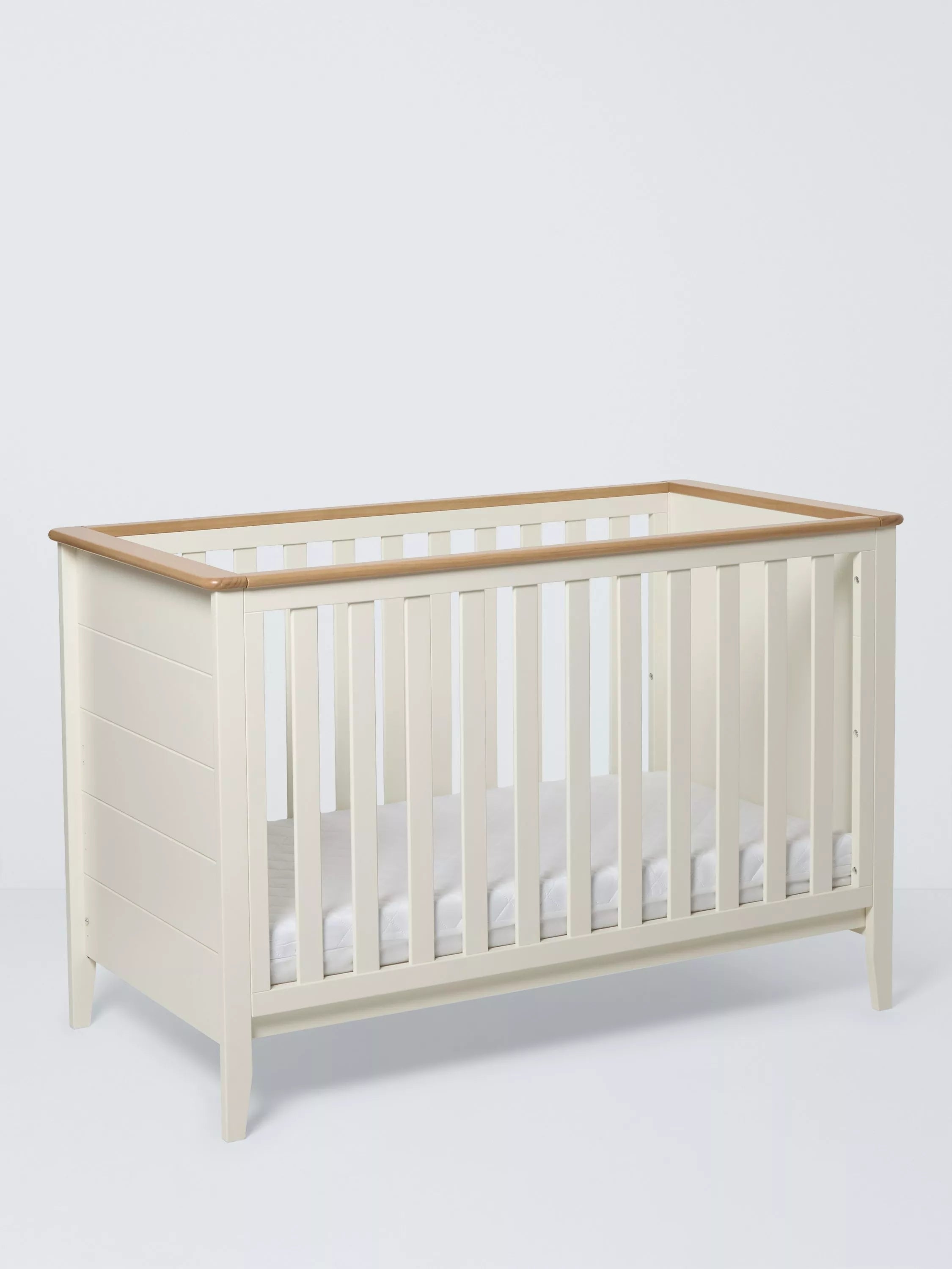 This standard-sized cot offers a tranquil sleep space for your little one from birth. With 2 base heights, you can adjust the cot as they grow. Plus, the sleek contemporary style combines painted and natural wood for a look that works with any nursery theme.