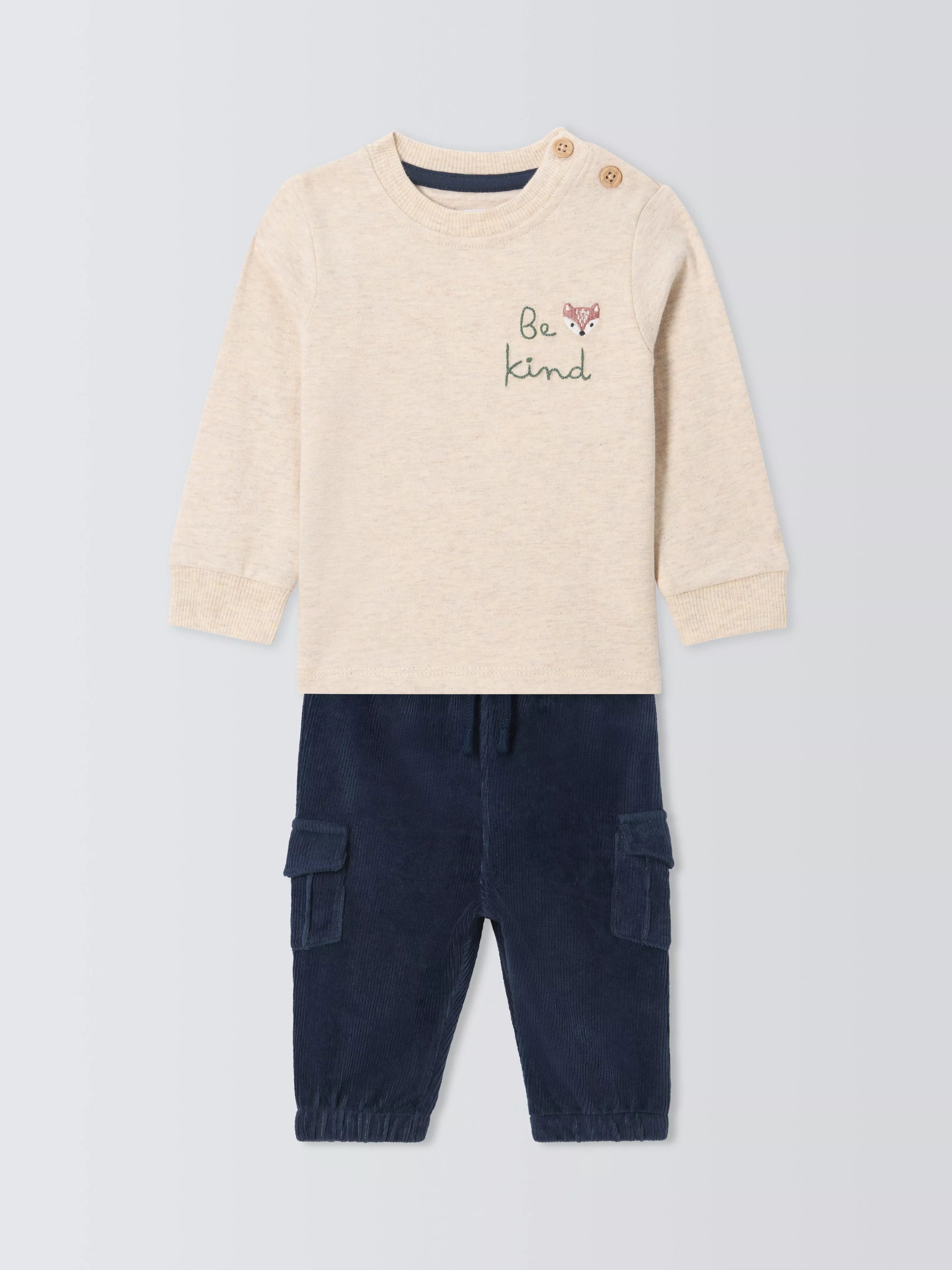 A baby clothes set including a soft cotton sweater with a sweet "Be Kind" motto and durable corduroy trousers that will withstand miles and miles of crawling.