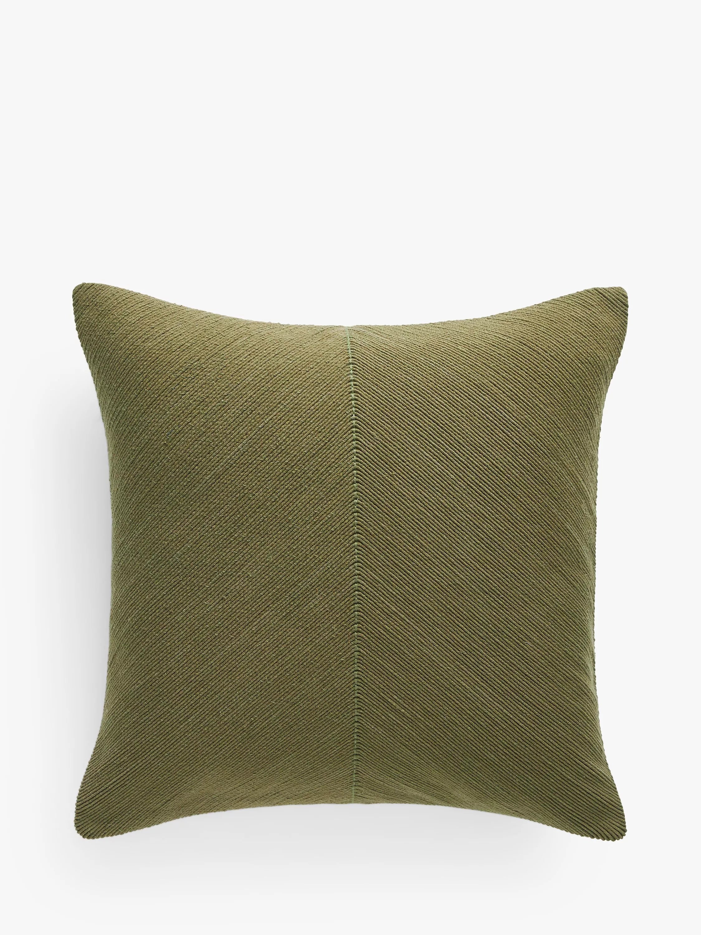 This cotton cushion is woven with a simple corded "v" design and hand-guided embroidery detail.