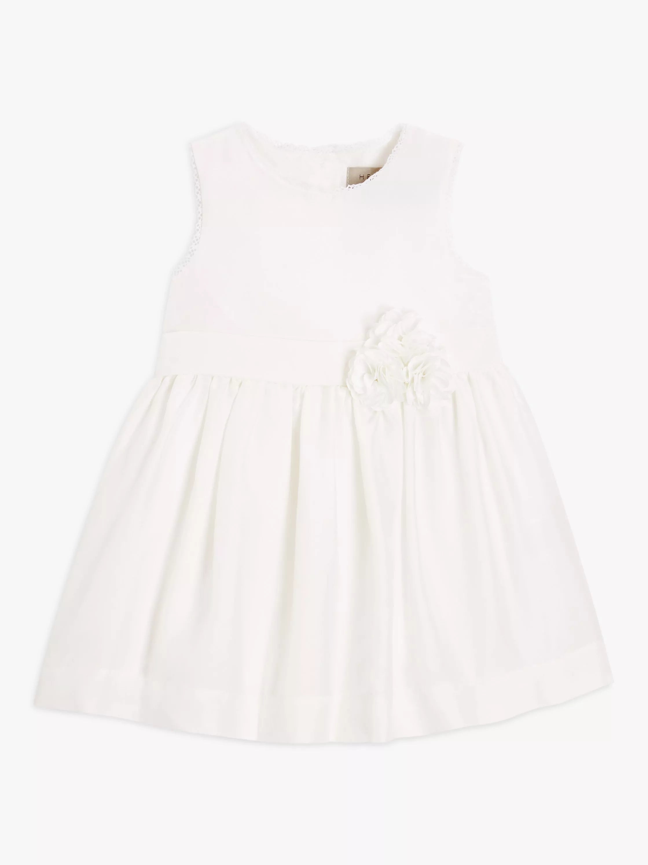 The fully lined dress is made from cotton for comfortable wear. Lace detailing around the sleeves adds subtle detail as well as the flower corsage at the waist. A tulle overlay creates a full skirt so baby can twirl and whirl while looking pretty. Add frilly socks and smart shoes for a gorgeous look.