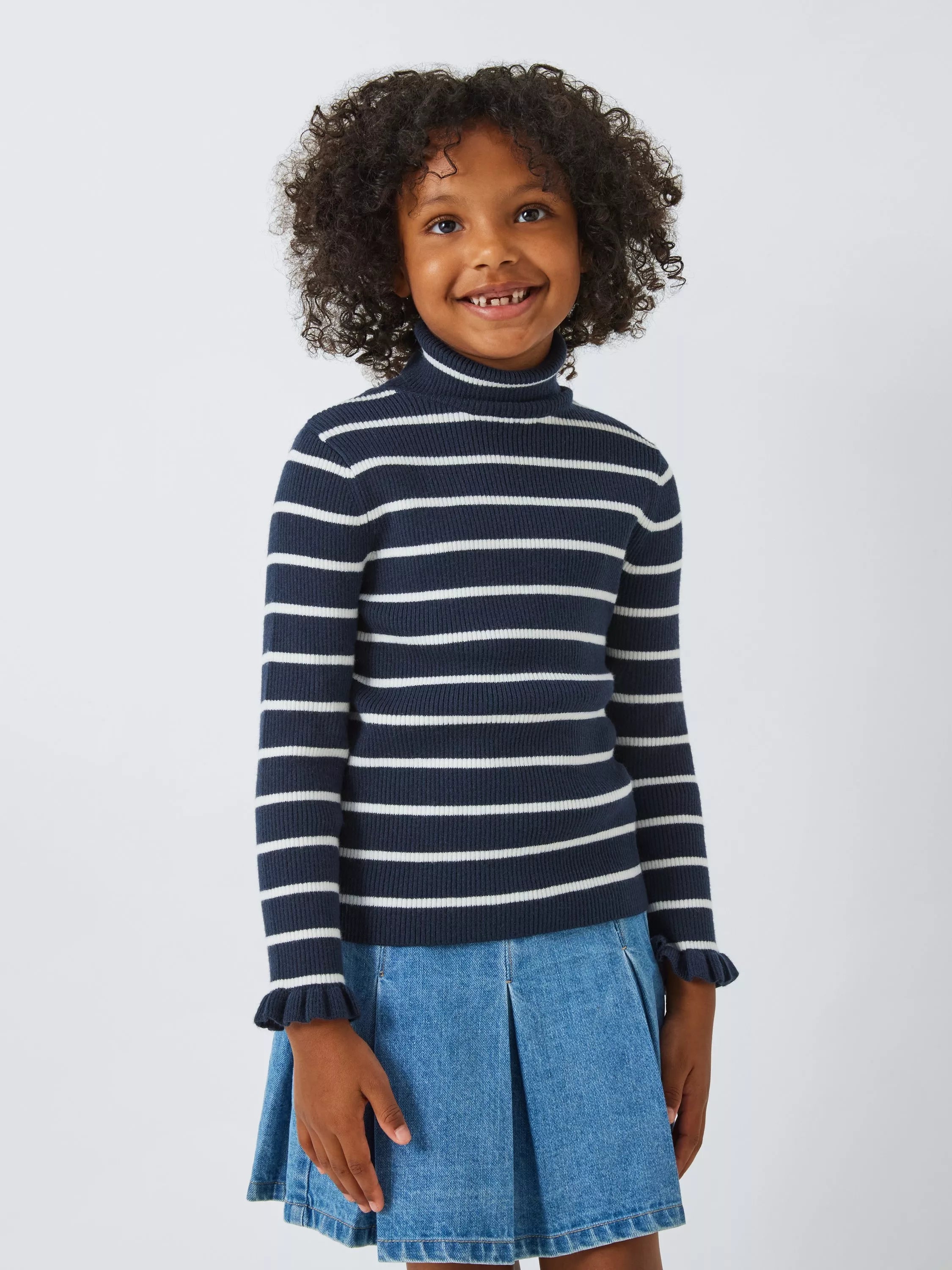 A classic stripe roll neck is given a playful update courtesy of the fun, ruffle cuffs.