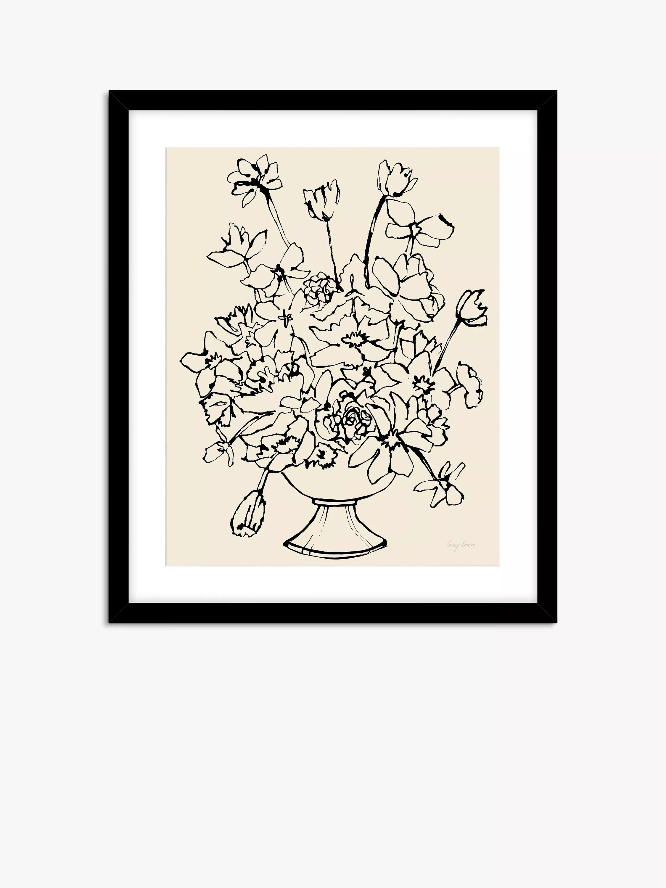 'Flowers in a Pedastal Vase' by Lucy Deaner. Made in the UK, this glazed print is mounted in a contemporary black frame, ready to hang on your wall.